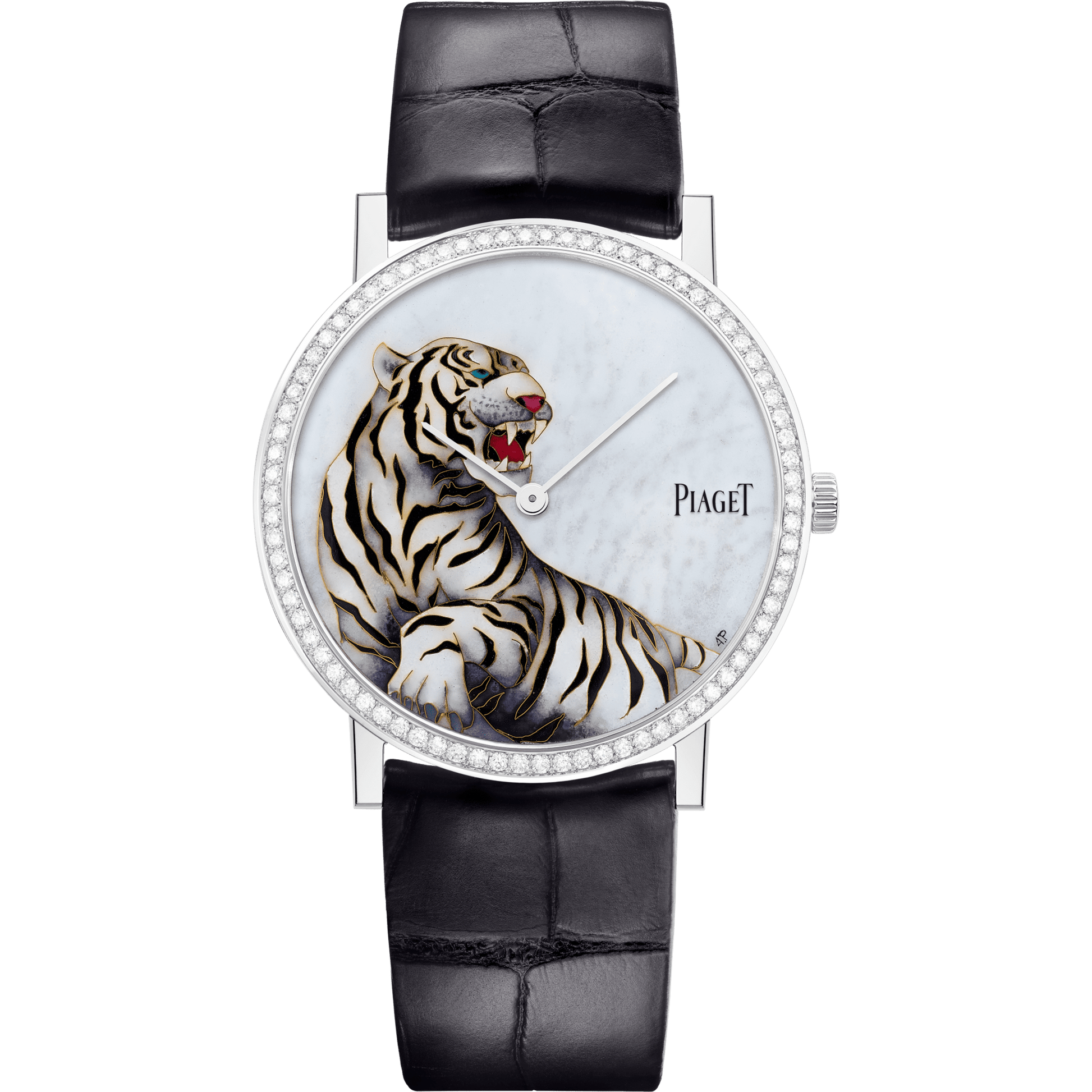 Altiplano Zodiac watch, 38 mm. Case in rhodium finish 18K white gold set with 78 brilliant-cut diamonds (approx. 0.7 ct). Dial with cloisonné enamel Tiger motif. Manufacture 430P ultra-thin hand-wound mechanical movement. Limited edition of 38 individually numbered timepieces.
