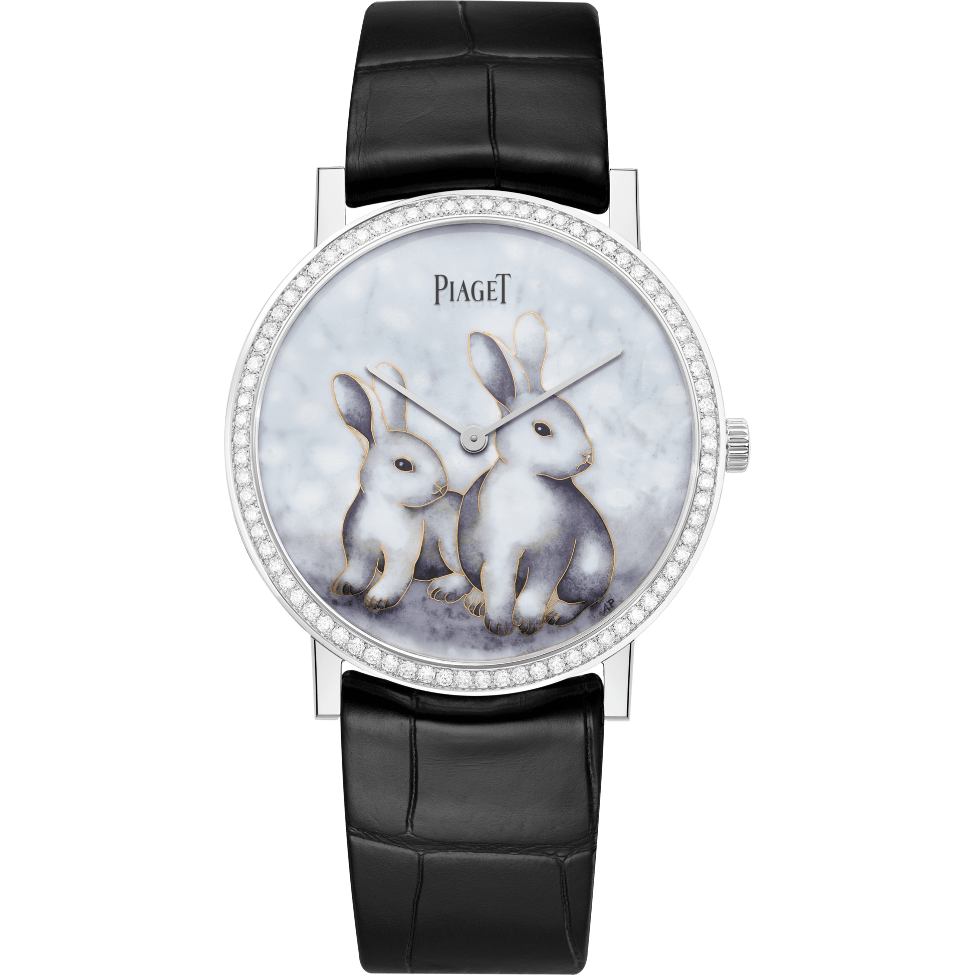 Altiplano Zodiac watch, 38 mm. Case in rhodium finish 18K white gold set with 78 brilliant-cut diamonds (approx. 0.7 ct). Dial with cloisonné enamel Rabbit motif. Manufacture 430P ultra-thin hand-wound mechanical movement. Limited edition of 38 individually numbered timepieces.