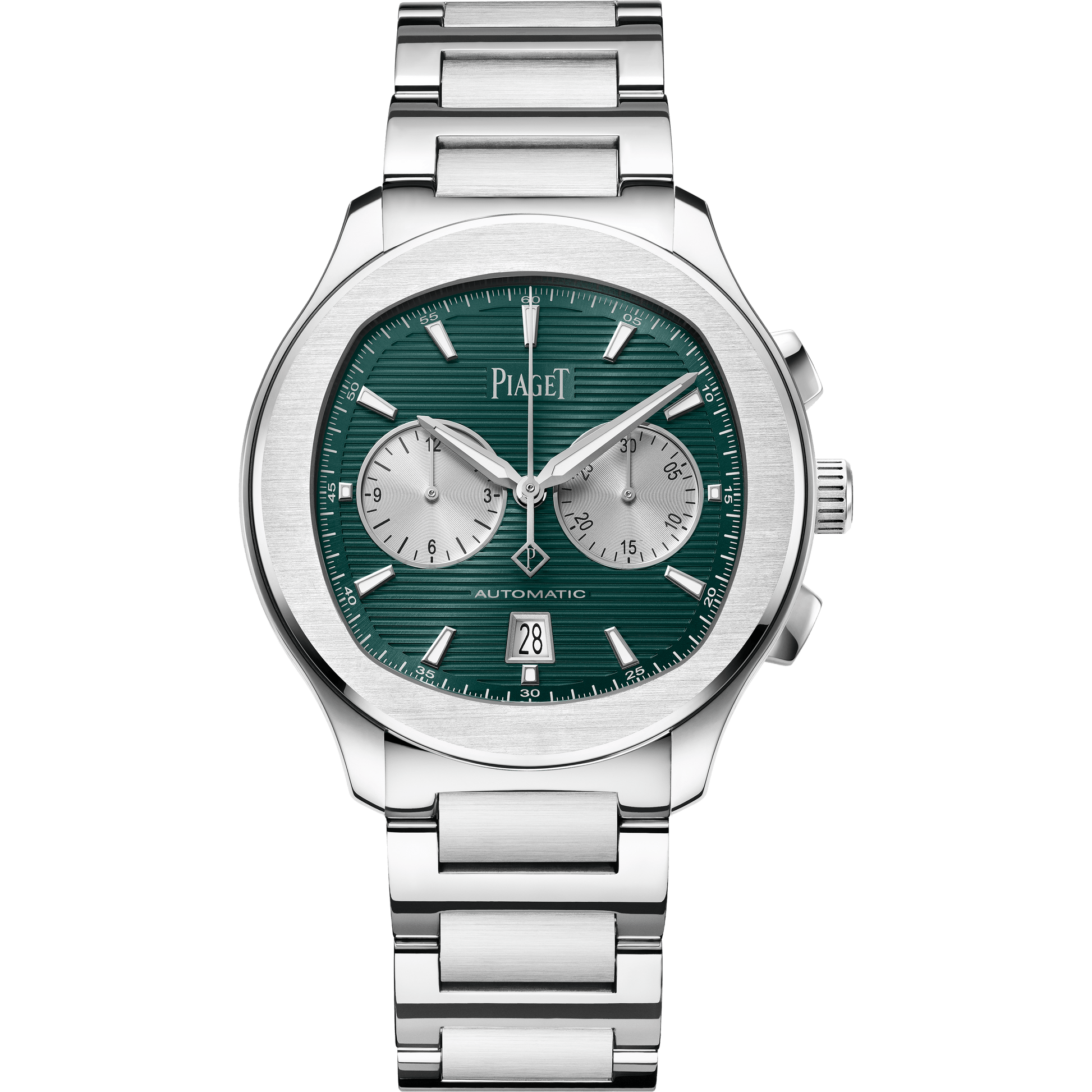 Piaget Polo Chronograph watch, 42 mm. Steel case. Green dial with SuperLumiNova® counters and indexes. Sapphire crystal case back. Manufacture 1160P automatic mechanical movement with chronograph and date.