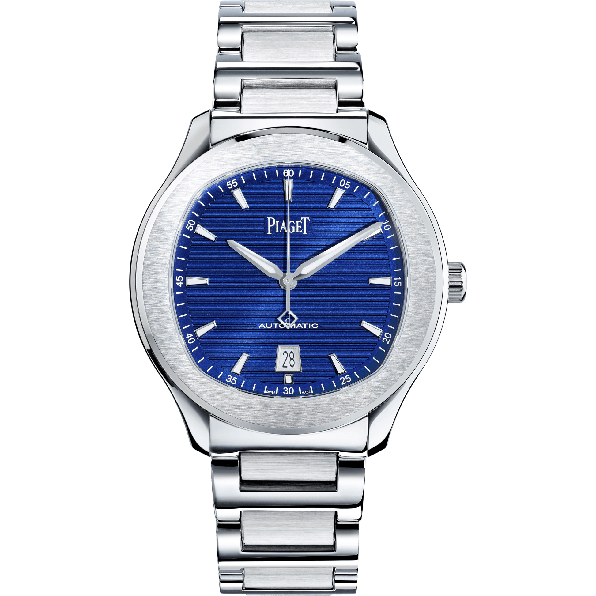 A new man’s model with a strong character, this automatic watch has a casual elegance that is ideal for every occasion. Available with a polished and satin-brushed steel bracelet, merging perfectly with its curved case, this masculine luxury watch has contemporary lines and is remarkably comfortable to wear. Housed in a case-middle combining round and cushion-shaped forms in the purest Piaget aesthetic tradition, the blue horizontal guilloché dial, divided up by luminescent applied hour-markers, displays hours, minutes and seconds, and the date at 6 o’clock. The 42 mm-diameter steel case, water-resistant to 10 ATM, displays an elegant interplay of alternating polished and satin-brushed finishes. Its sapphire crystal case back reveals the refined finishings of the new 1110P Manufacture automatic movement and its anthracite-gray oscillating weight, engraved with the Piaget coat-of-arms. As the ultimate aesthetic detail, the trotteuse hand is decorated with an openworked letter “P”, the symbol of the famous Swiss watchmaker.