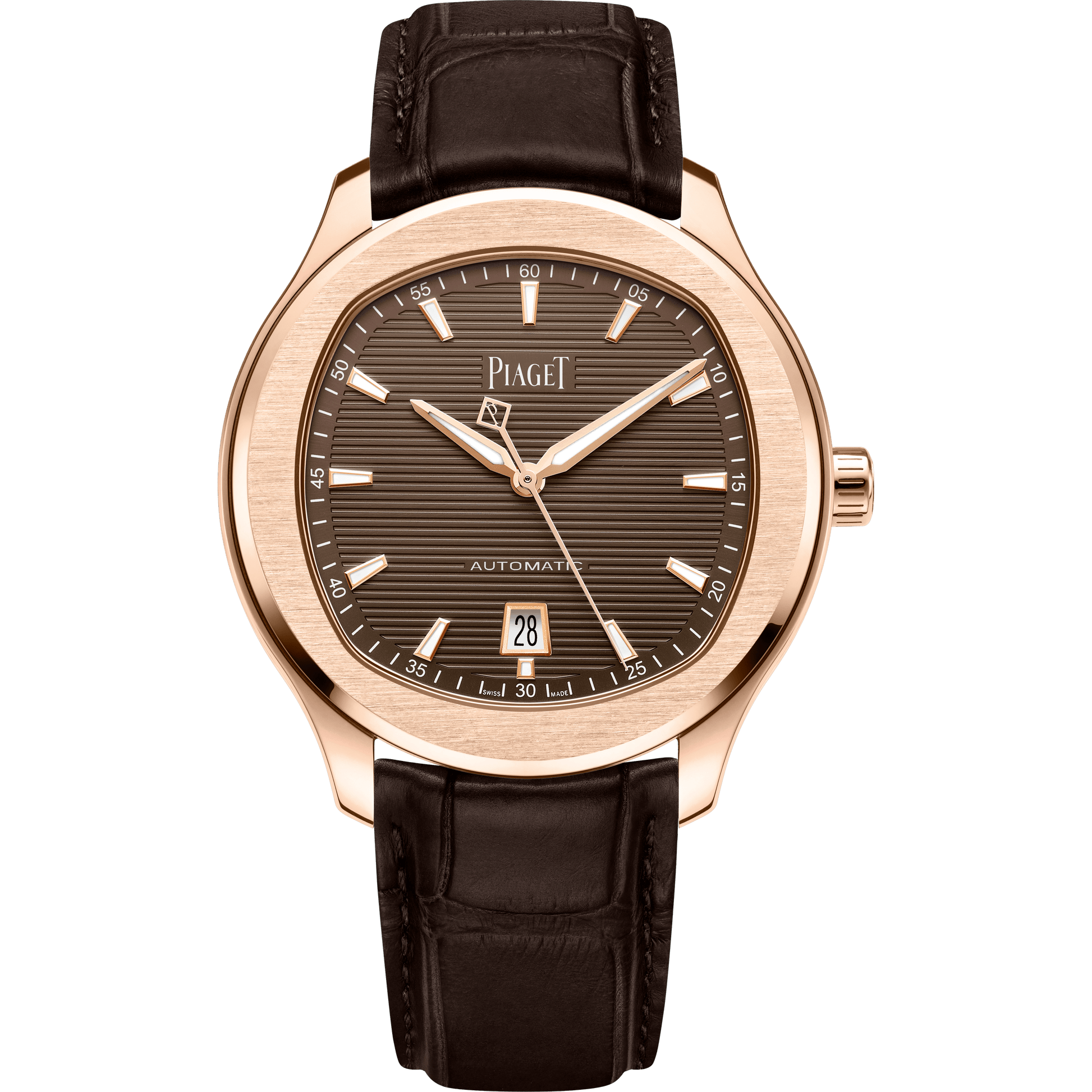 Piaget Polo Date watch, 42 mm. Case in 18K rose gold. Dial with SuperLumiNova® counters and indexes. Brown chocolate dial and brown   bracelet. Sapphire crystal case back. 1110P Manufacture automatic mechanical movement.