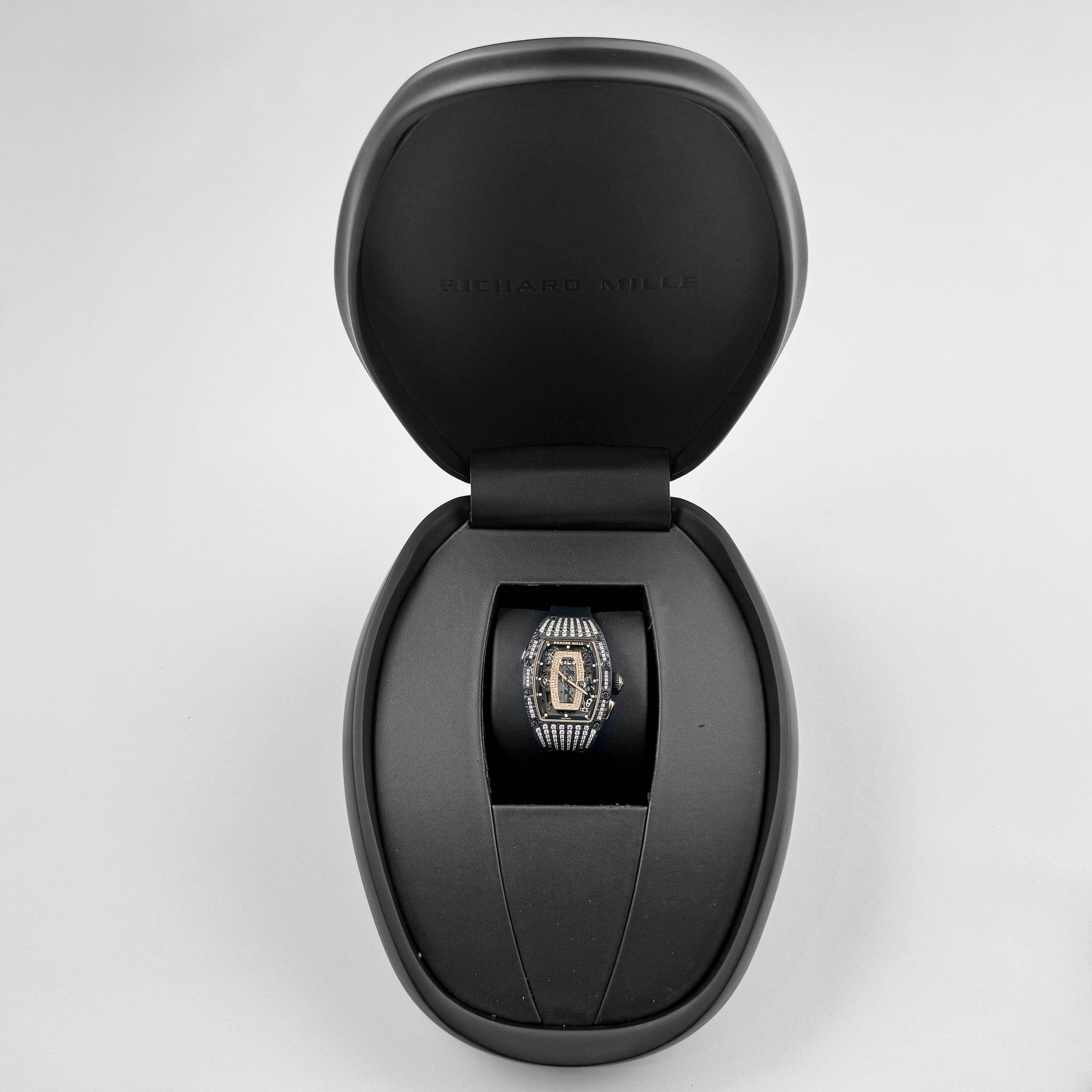 The Richard Mille RM 037 in rose gold and Carbon TPT® with diamonds is a bold fusion of avant-garde materials and high jewelry aesthetics, engineered with the distinctive technical flair that defines the brand. The asymmetrical case, crafted in a combination of 18k rose gold and Carbon TPT®, measures approximately 52.63 x 34.40mm, and features a diamond-set bezel that contrasts beautifully against the layered, matte-black grain of the carbon—creating a watch that’s both sculptural and luxurious.
