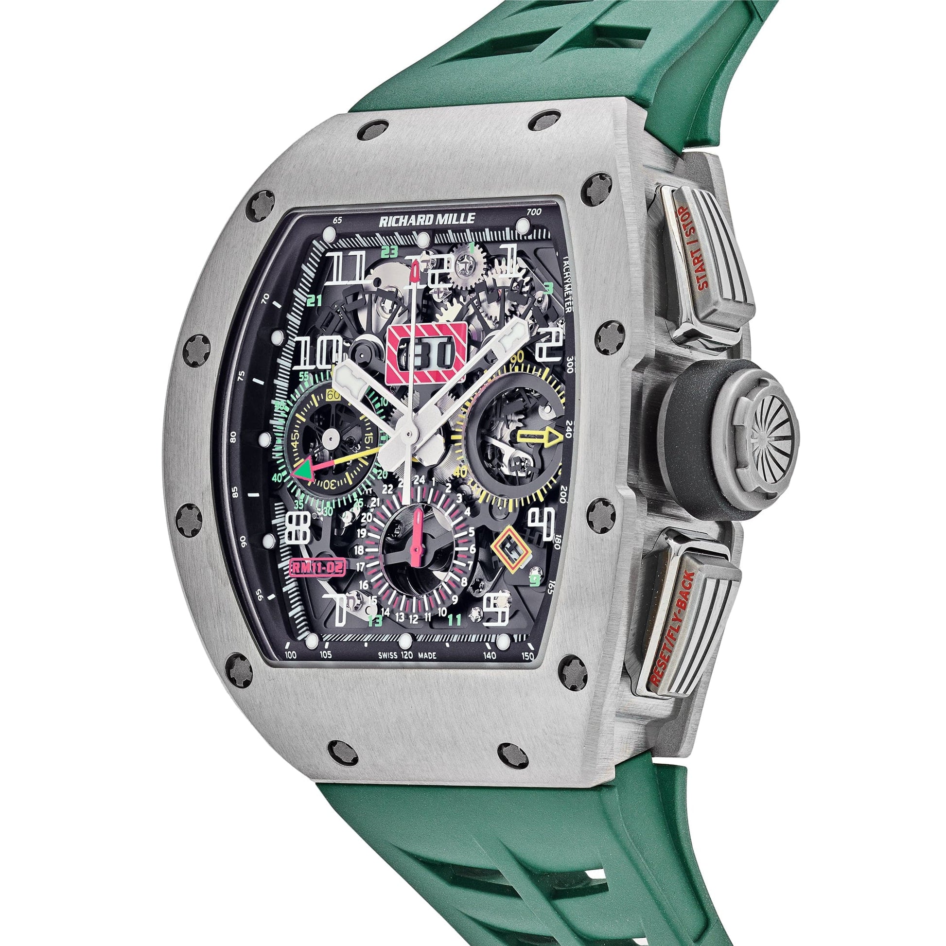 The Richard Mille RM 11-02 Titanium Flyback Chronograph GMT combines cutting-edge functionality with lightweight titanium construction. Featuring a flyback chronograph and GMT complication, this timepiece offers seamless precision for both timing and time zone adjustments. The durable titanium case ensures strength and comfort, while its modern design and advanced movement make it a standout piece for collectors seeking high-performance, versatility, and innovation in one exclusive timepiece.