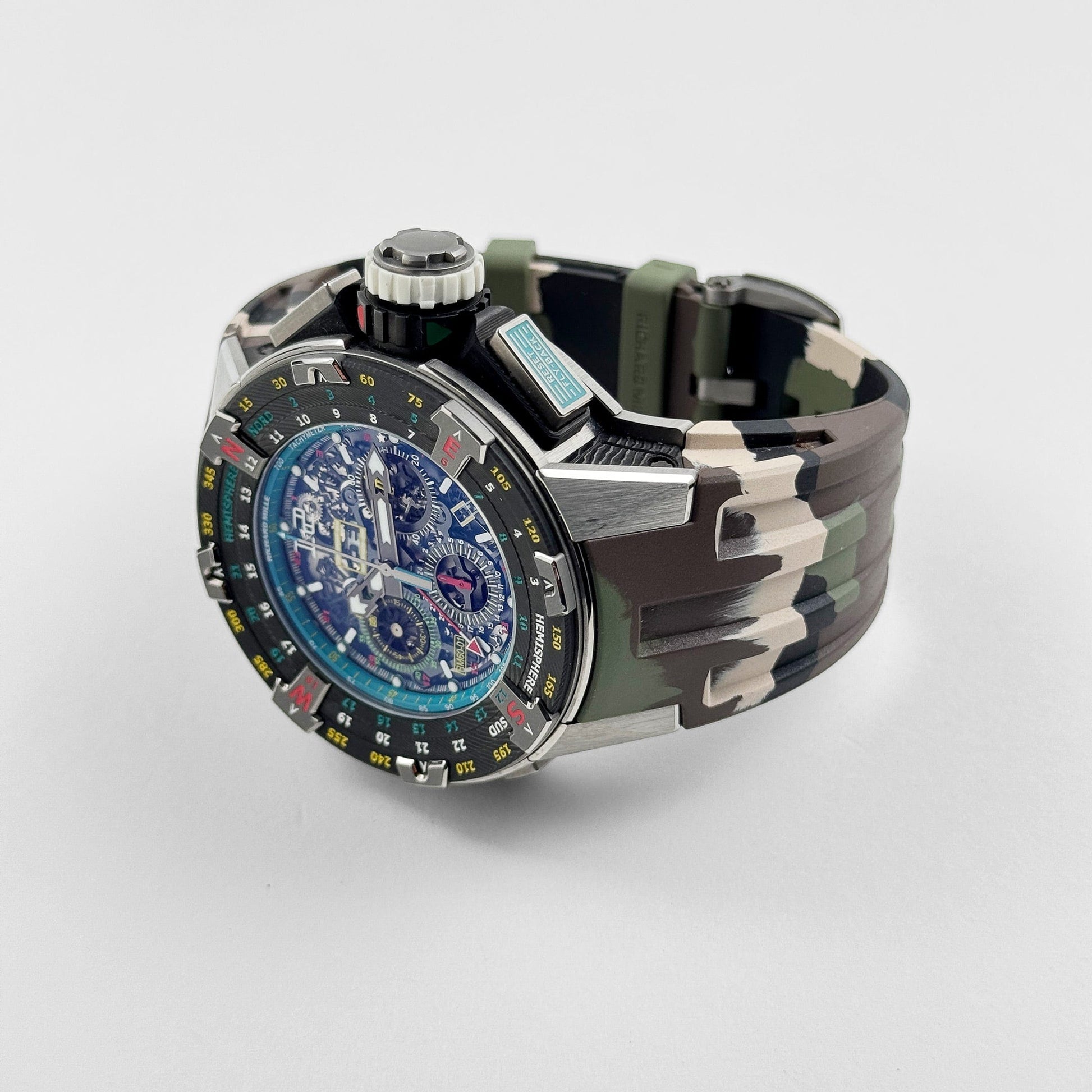 The Richard Mille RM 60-01 "Les Voiles de St Barth" masterfully fuses nautical utility with avant-garde design in a bold 50 mm titanium and carbon case. Its skeletonized dial, under double sapphire glass, includes a flyback chronograph, annual calendar, oversize date, month display, UTC, and 60-minute countdown—all arranged for clarity in dynamic conditions. A turquoise flange marked with “Les Voiles de St Barth” logo frames the dial, while a bi-directional rotating bezel doubles as a functional compass—ideal for orientation at sea.