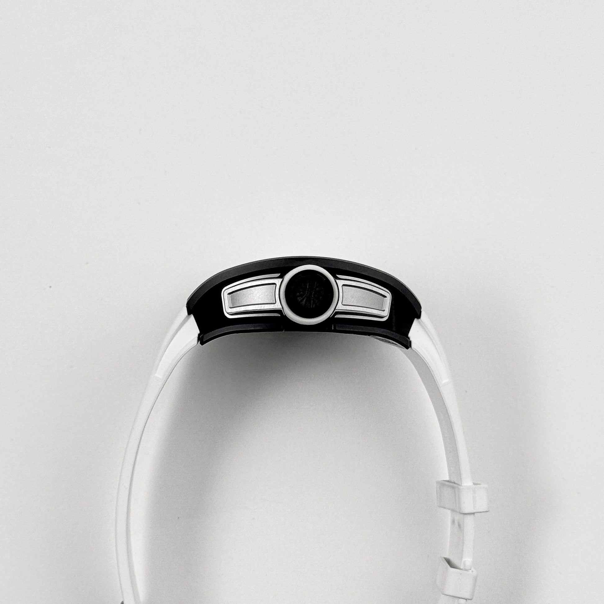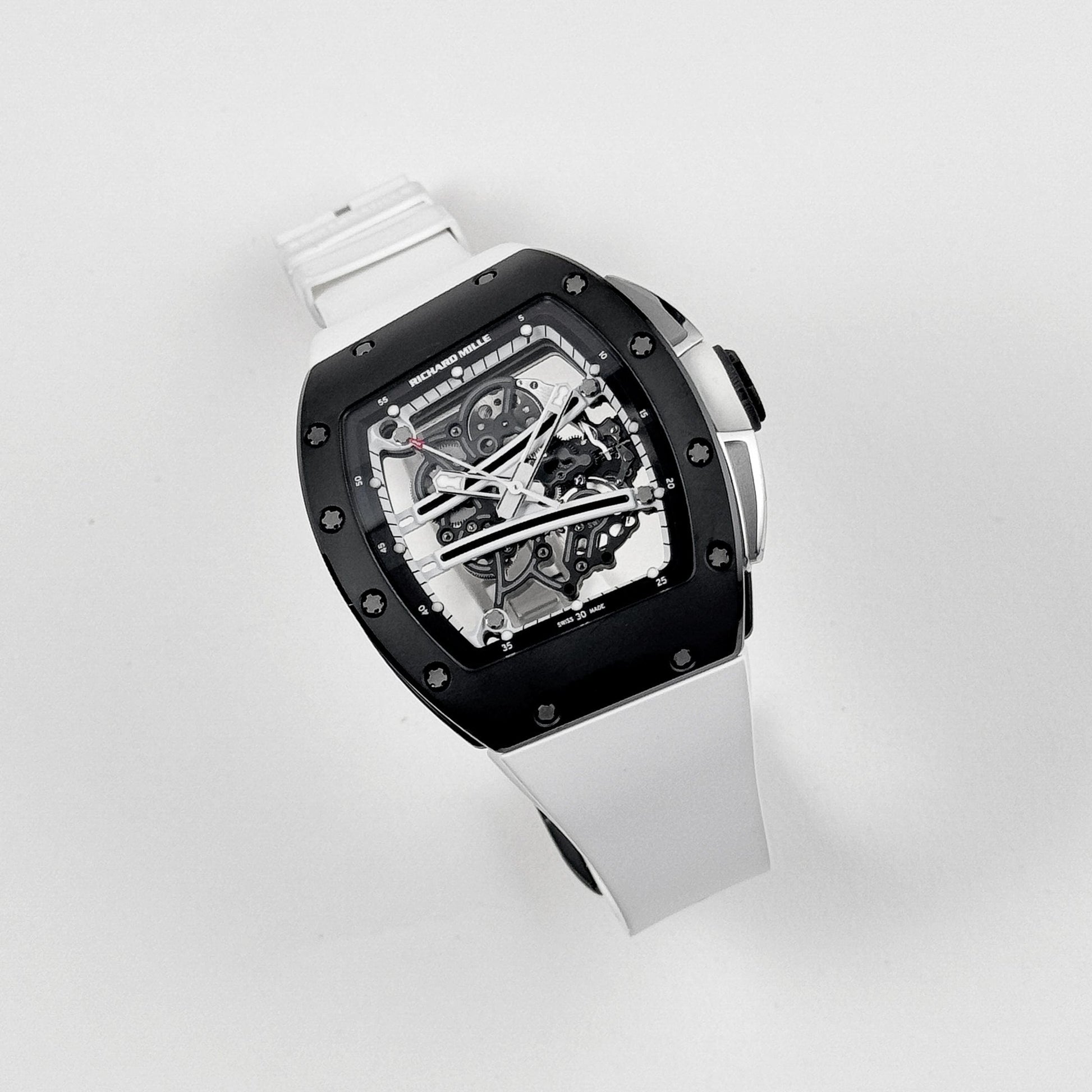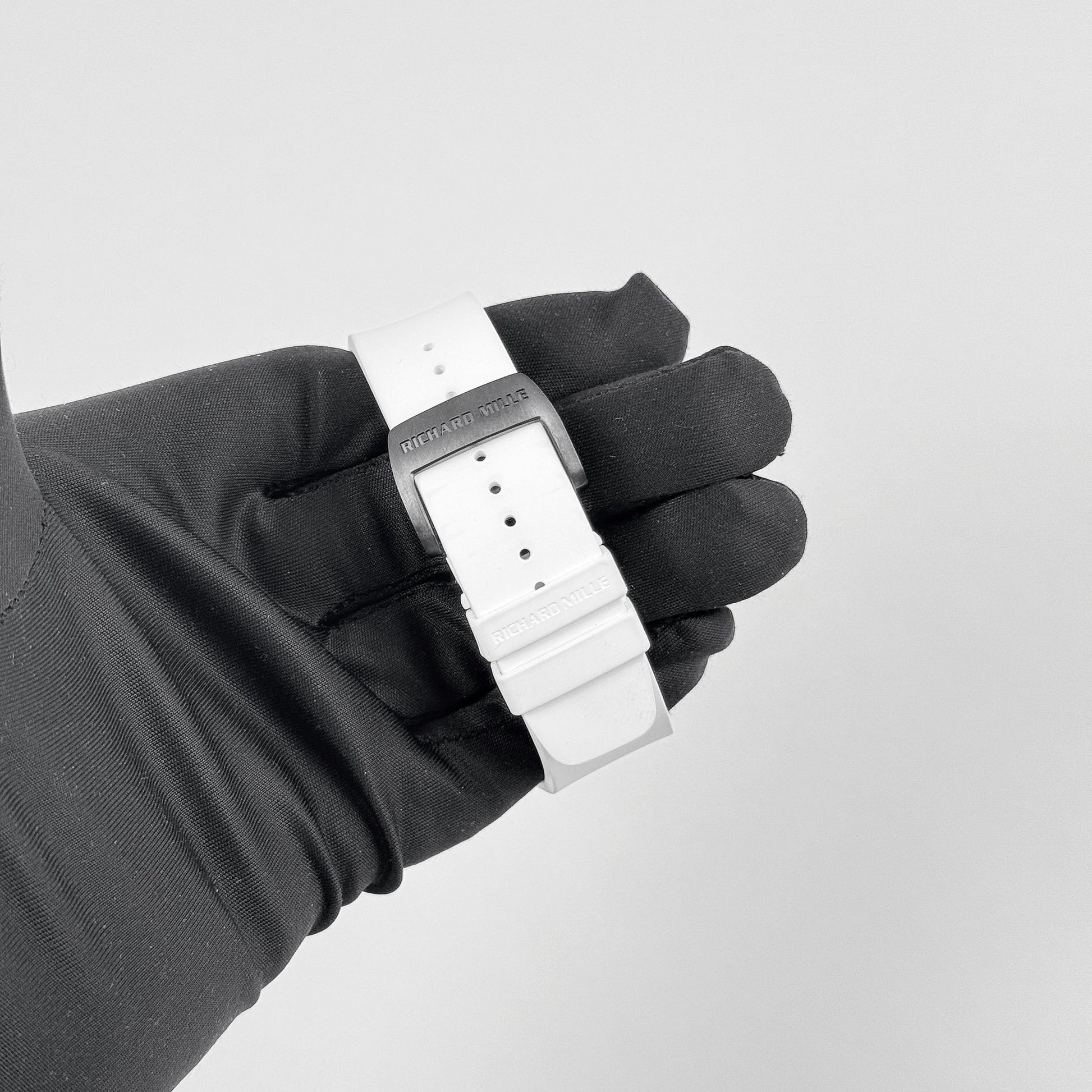 The skeletonized manual-winding movement is built from grade 5 titanium, shock-resistant to over 5,000 Gs, and delivers a 55-hour power reserve. Paired with a rubber strap, the RM 61-01 Monochrome blends elite athletic performance with bold, monochromatic style.
