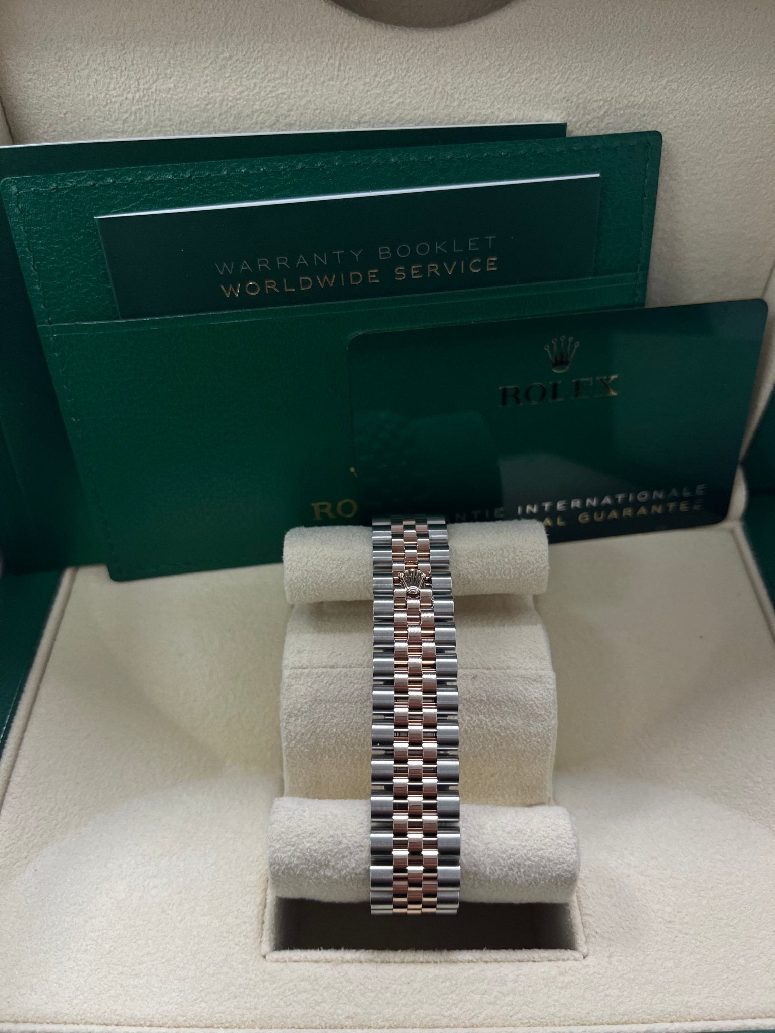 31mm Everose Rolesor case comprised of Oystersteel and 18K Everose gold, screw-down back, screw-down crown with twinlock double waterproofness system, 18K Everose gold bezel set with 46 diamonds, scratch-resistant sapphire crystal with cyclops lens over the date, white mother-of-pearl dial, diamond hour markers, Rolex calibre 2236 perpetual self-winding movement with date at 3 o'clock, approximately 55 hours of power reserve, Everose Rolesor Jubilee bracelet with semi-circular three-piece links, concealed folding Crownclasp buckle. Waterproof to 100 meters.