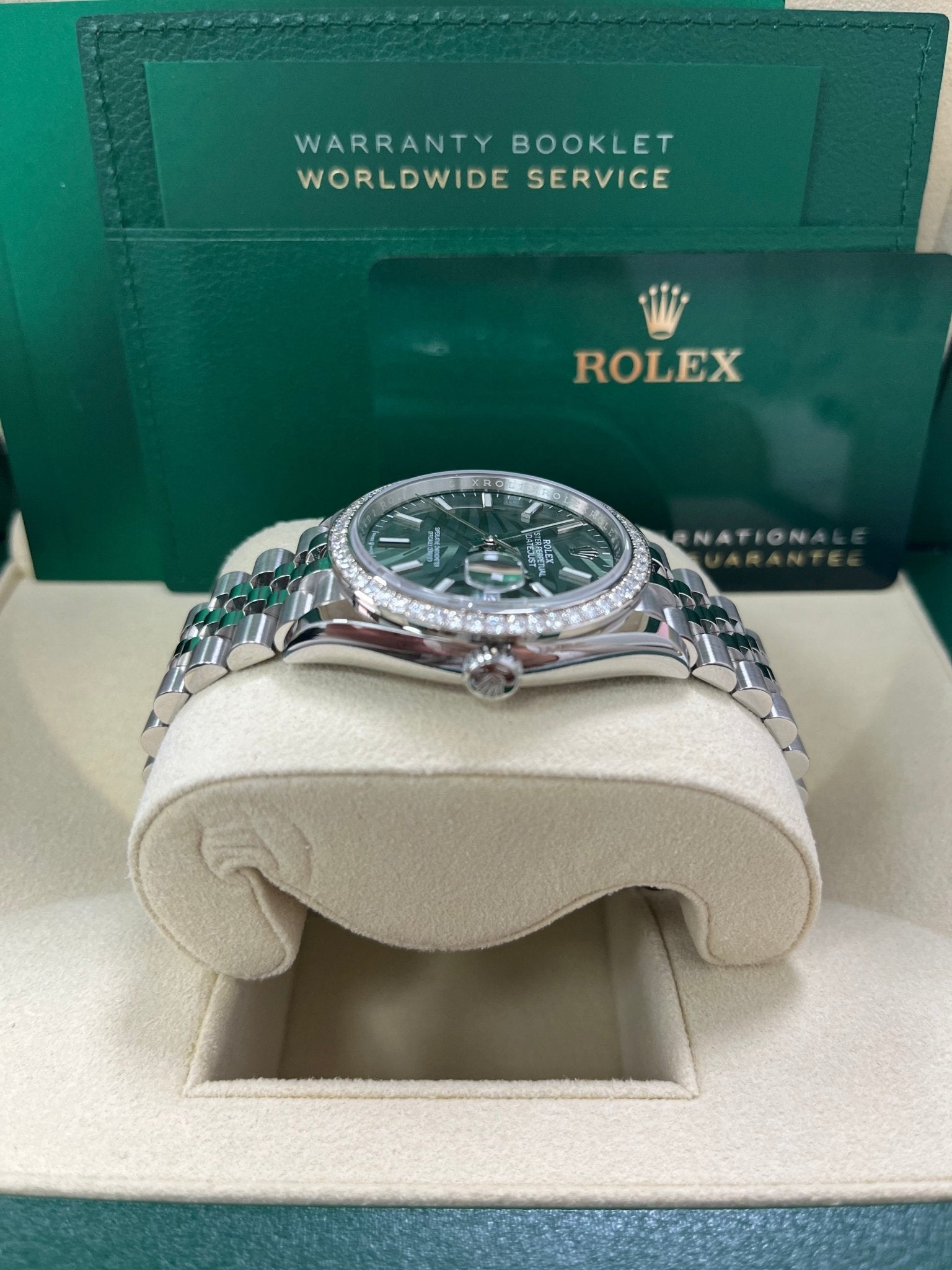 36mm white Rolesor case comprised of Oystersteel and white gold, screw-down back, screw-down crown with twinlock double waterproofness system, diamond bezel, scratch-resistant sapphire crystal with cyclops lens over the date, olive green palm motif dial, index hour markers, Rolex calibre 3235 perpetual self-winding movement with centre hour, minute and seconds hands, instantaneous date with rapid setting, and stop-seconds for precise time setting, approximately 70 hours of power reserve, Jubilee bracelet with five-piece links, folding Oysterclasp buckle with Easylink 5mm comfort extension link. Waterproof to 100 metres / 330 feet.