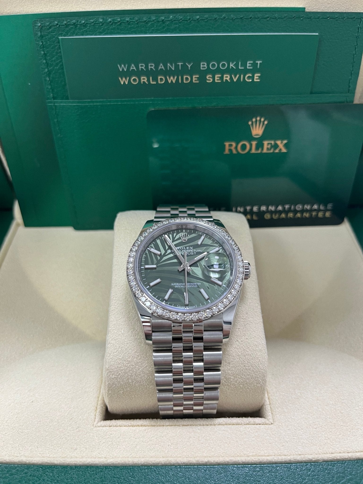 Rolex Datejust 36 Steel Diamond Bezel Olive Green Palm Index Dial Jubilee Band 126284rbr