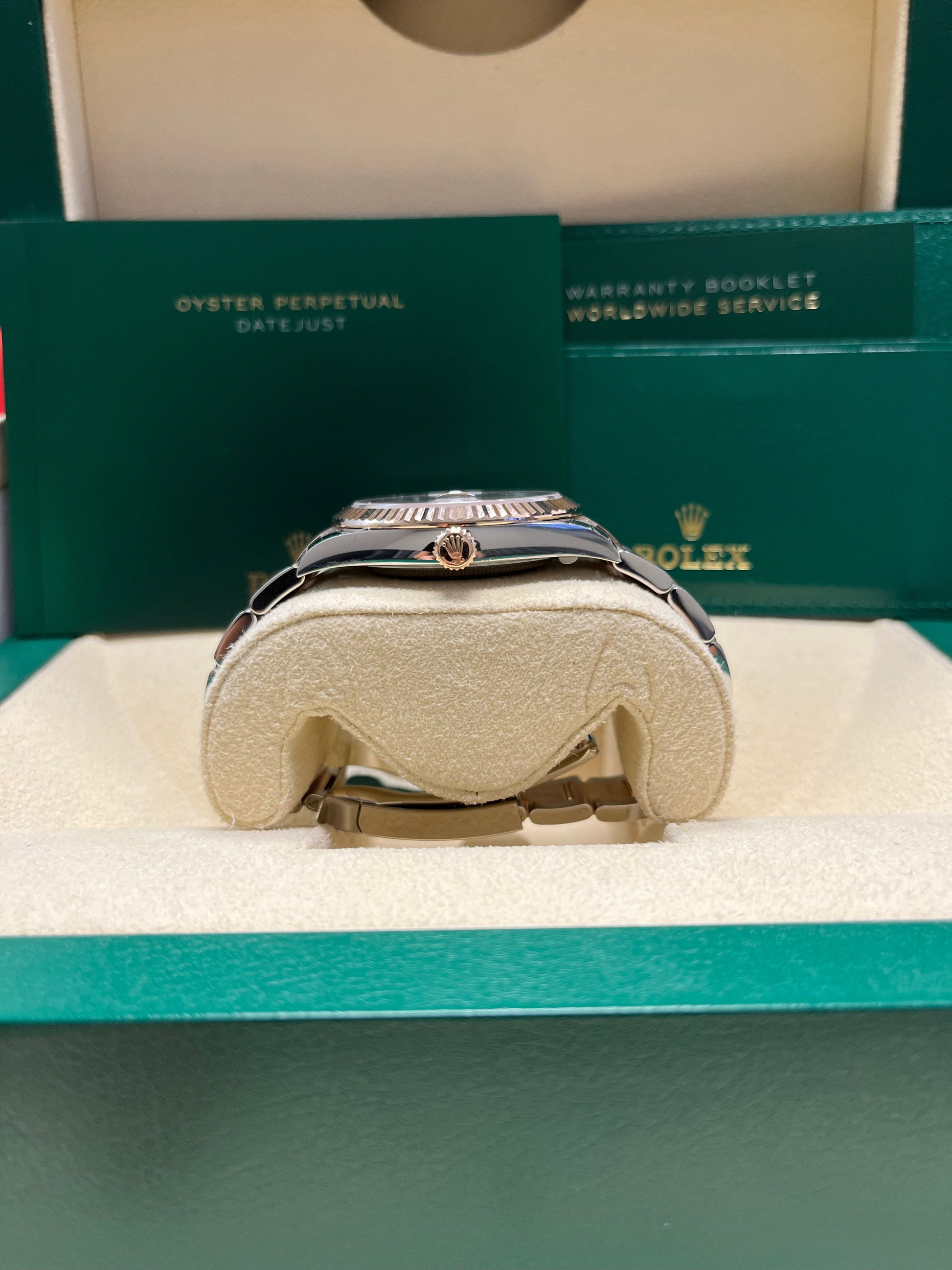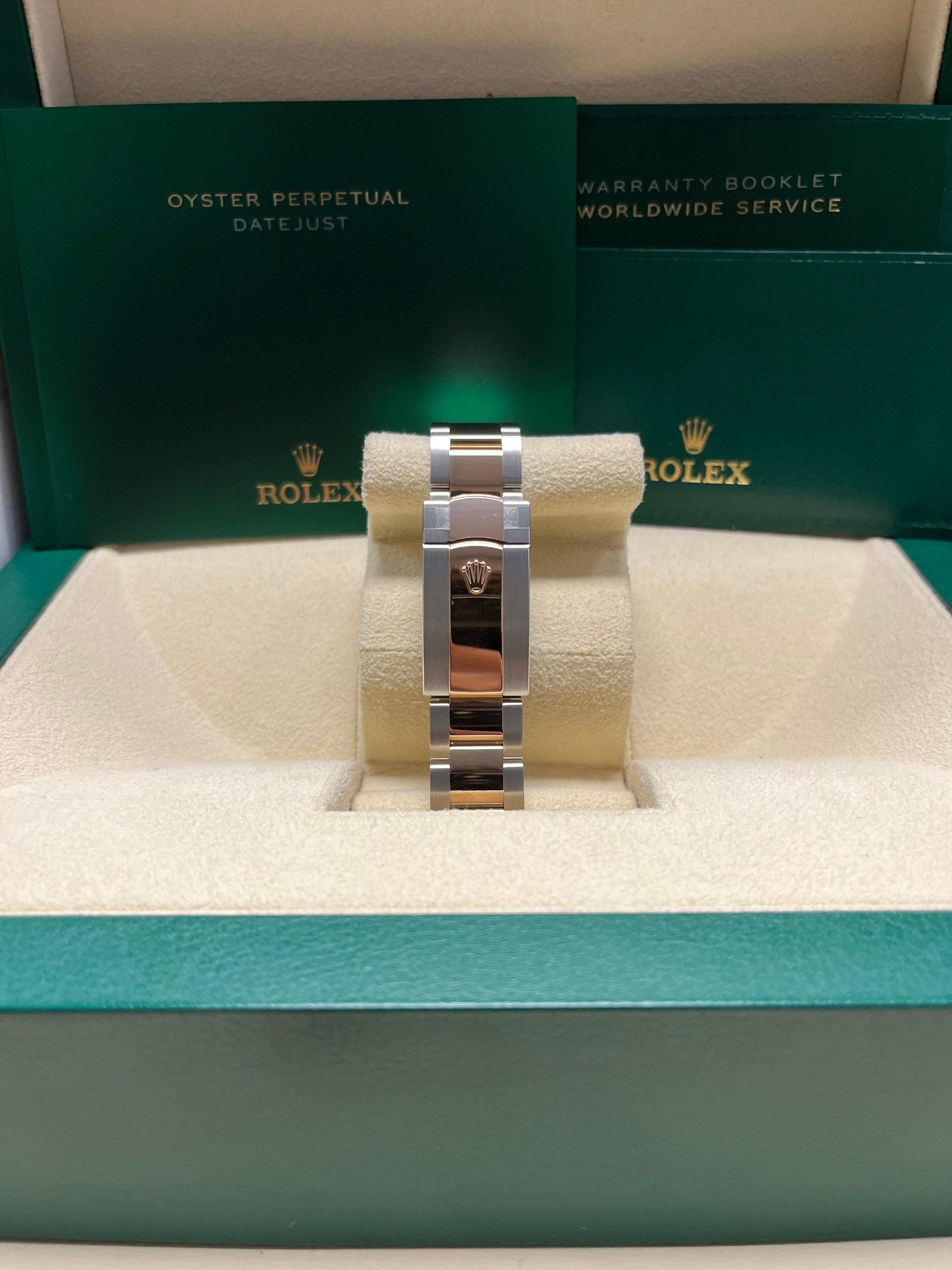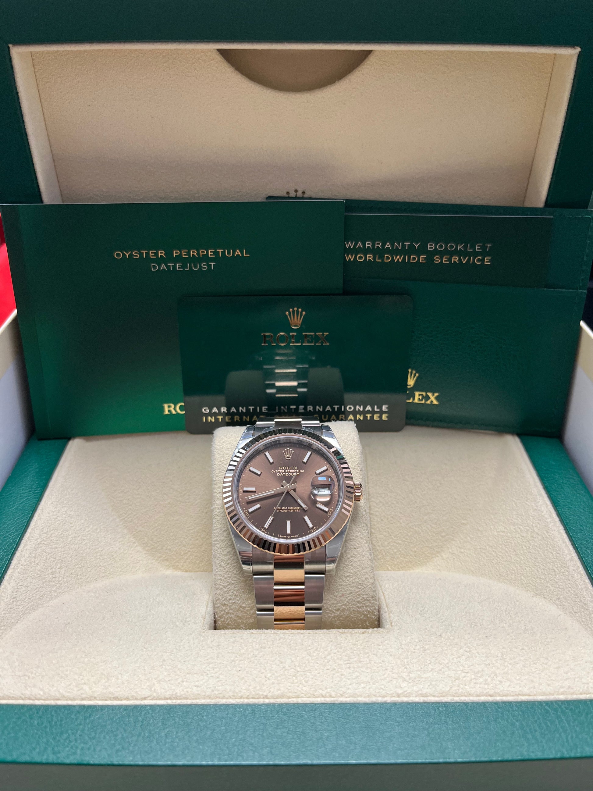 Stainless steel and 18k everose gold case with a stainless steel and 18k everose gold Rolex bracelet. Fixed 18k everose gold bezel. Chocolate dial with everose gold-tone hands and index hour markers. Date display at the 3 o'clock position. Rolex Calibre 3235 automatic movement with about 70 hours of power reserve. Scratch resistant sapphire crystal. Screw down crown. Solid case back. Case size: 41 mm. Round case shape. Concealed crown clasp. Water resistant at 100 meters / 330 feet. Functions: date, hour, minute, second The watch is in great condition as good as unworn, complete with tag, original box, manual and full international warranty papers.