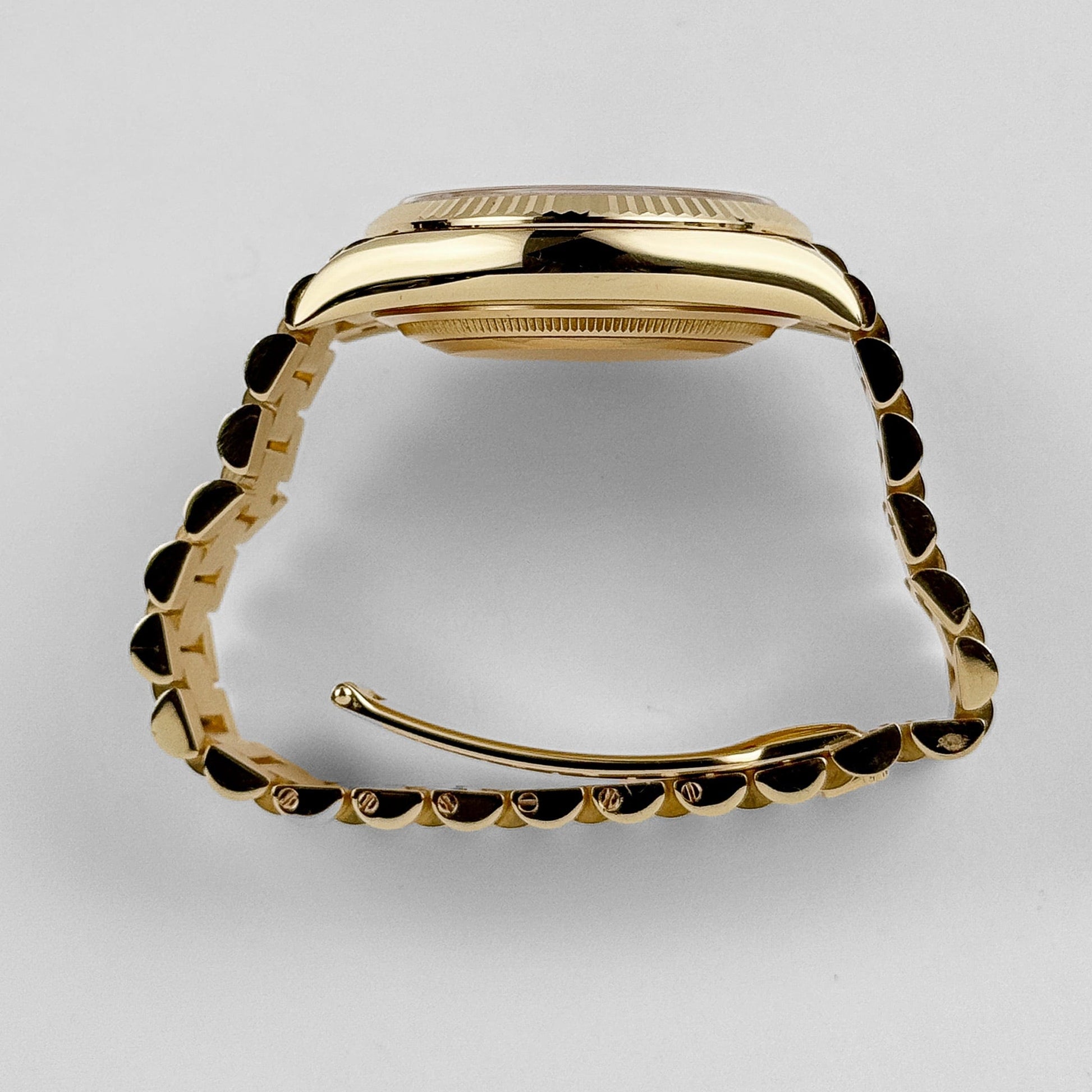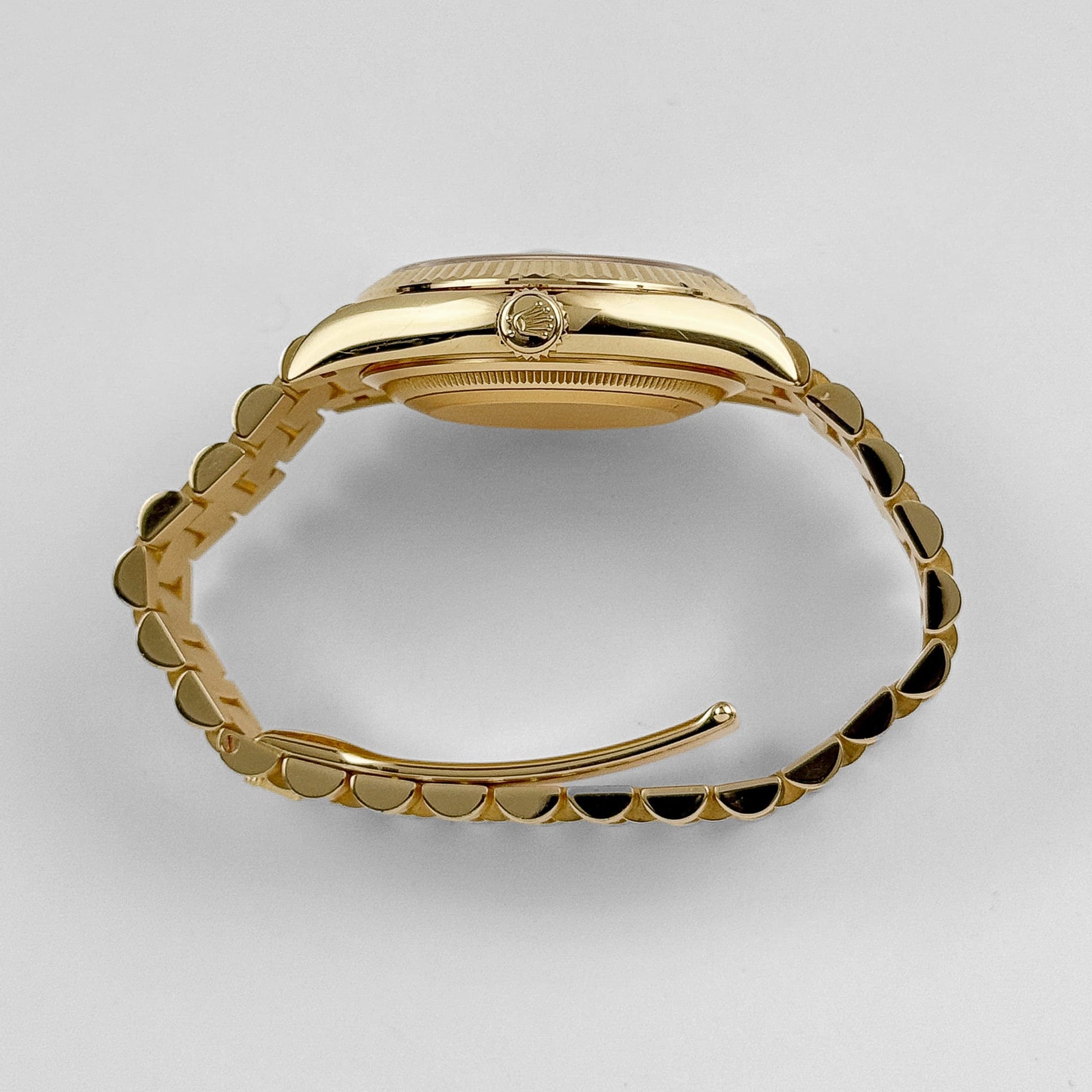 The Rolex Day-Date 128238 is a timeless embodiment of elegance and prestige, crafted in 18k yellow gold for a luxurious and classic appeal. Its 36mm case features the iconic fluted bezel, a hallmark of Rolex’s refined craftsmanship. The clean white dial provides a striking contrast, highlighted by yellow gold Roman numeral hour markers that exude understated sophistication.
