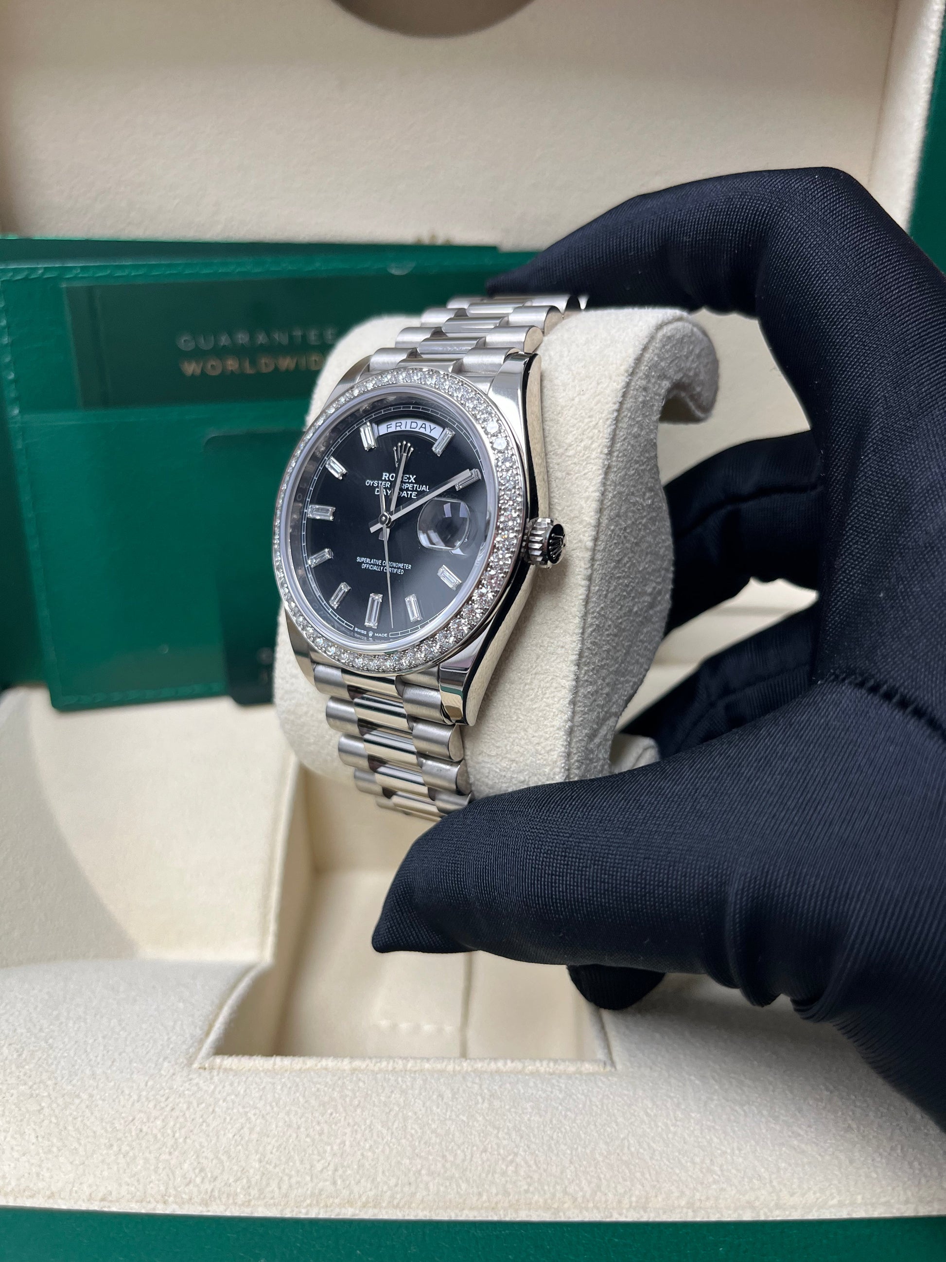 40mm 18K white gold case, screw-down back with Rolex fluting, screw-down crown with twinlock double waterproofness system, 18K white gold bezel set with 48 diamonds, scratch-resistant double anti-reflective sapphire crystal with cyclops lens over the date, black dial, 10 baguette diamond hour markers, Rolex calibre 3255 automatic movement with centre hour, minute and seconds hands, instantaneous day and date in apertures, unrestricted rapid-setting, and stop-seconds for precise time setting, approximately 70 hours of power reserve, President bracelet with three-piece solid links comprised of a polished center link, satin-finished outer links, and ceramic inserts, concealed folding Crownclasp buckle. Waterproof to 100 meters.