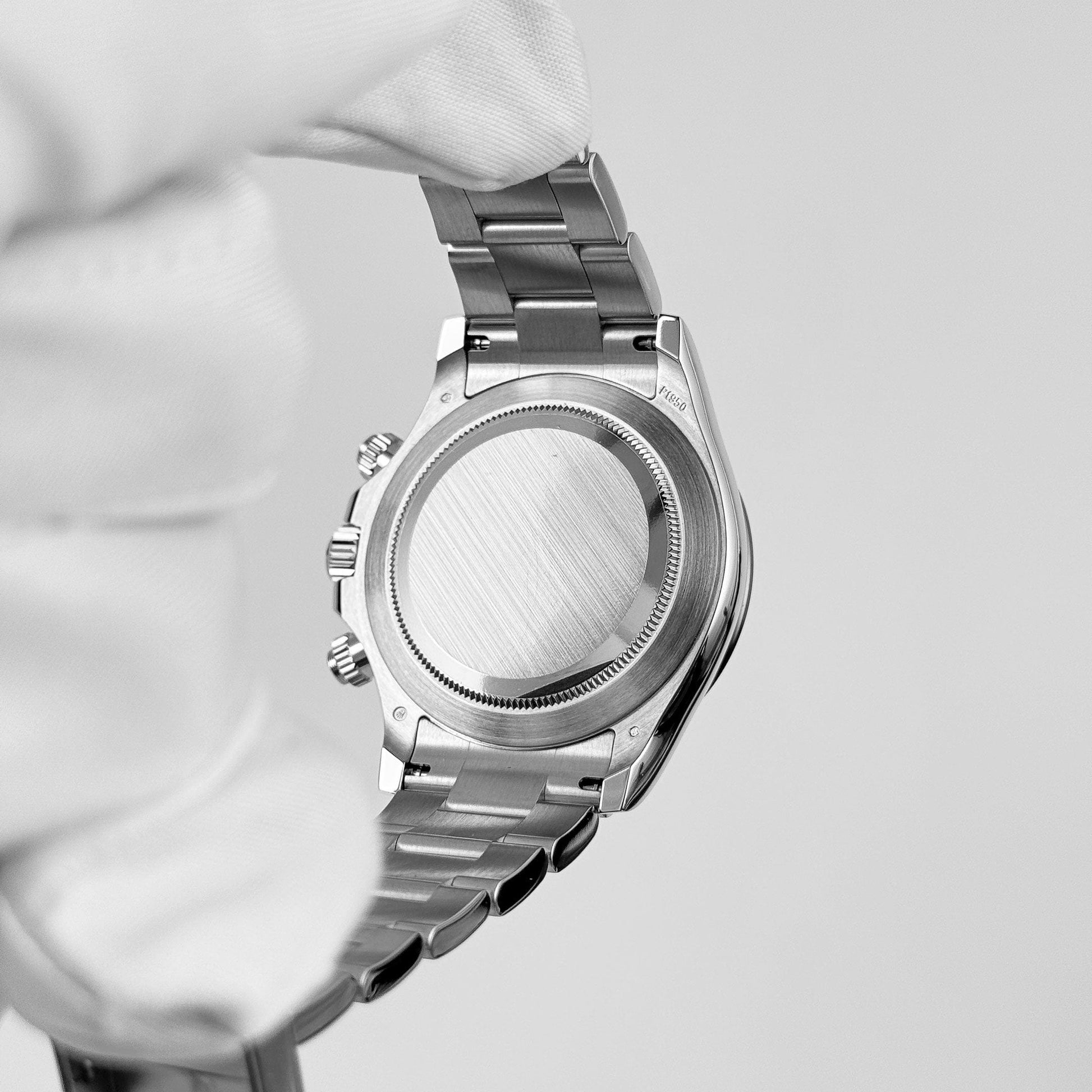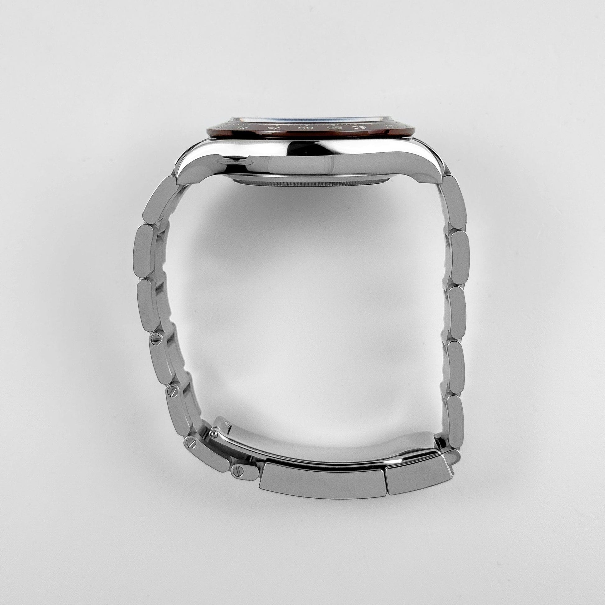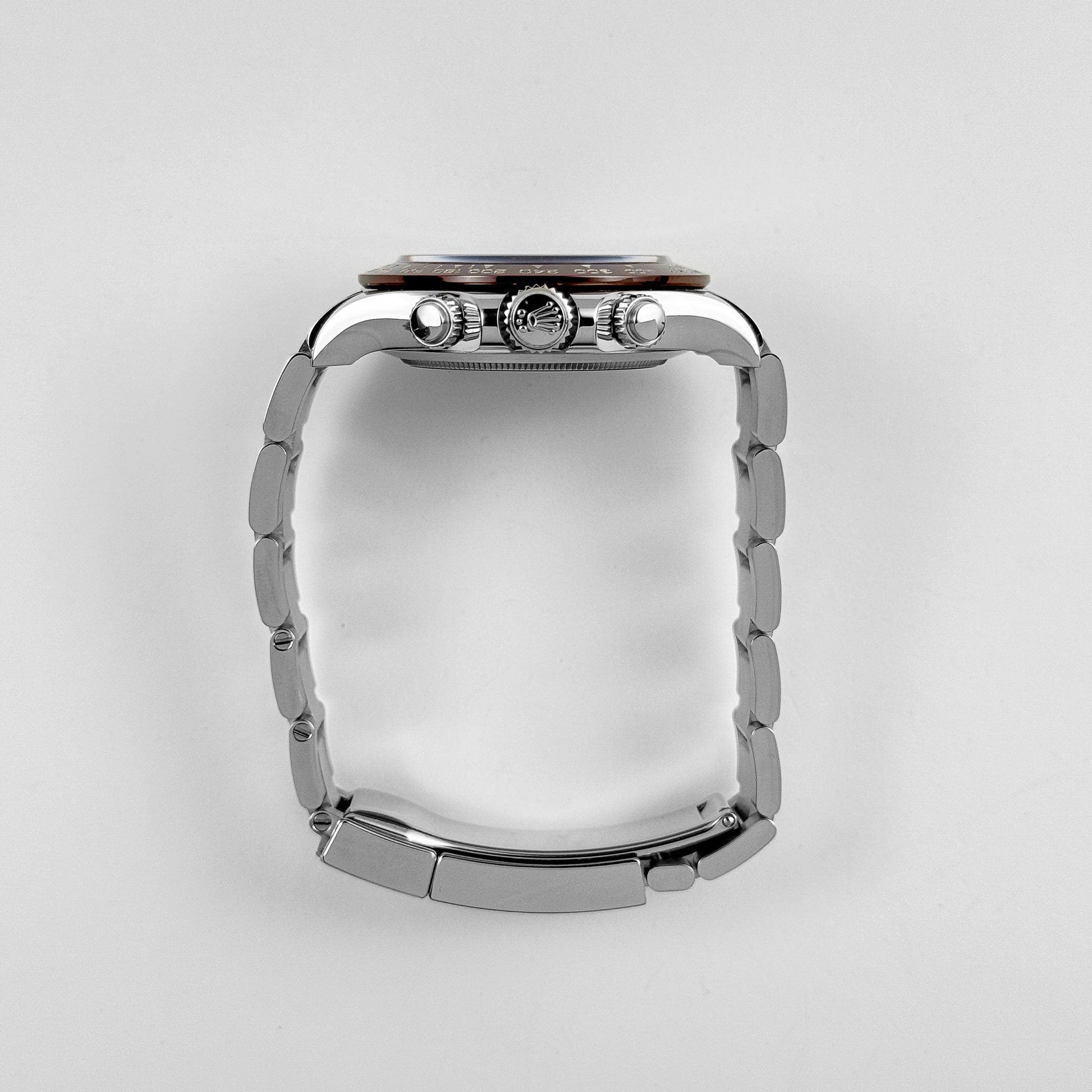 Equipped with a chestnut brown Cerachrom bezel, the watch contrasts beautifully with the cool tones of the platinum case and dial. Its chronograph subdials are perfectly arranged for precision timing, while the tachymetric scale allows for accurate speed calculations.