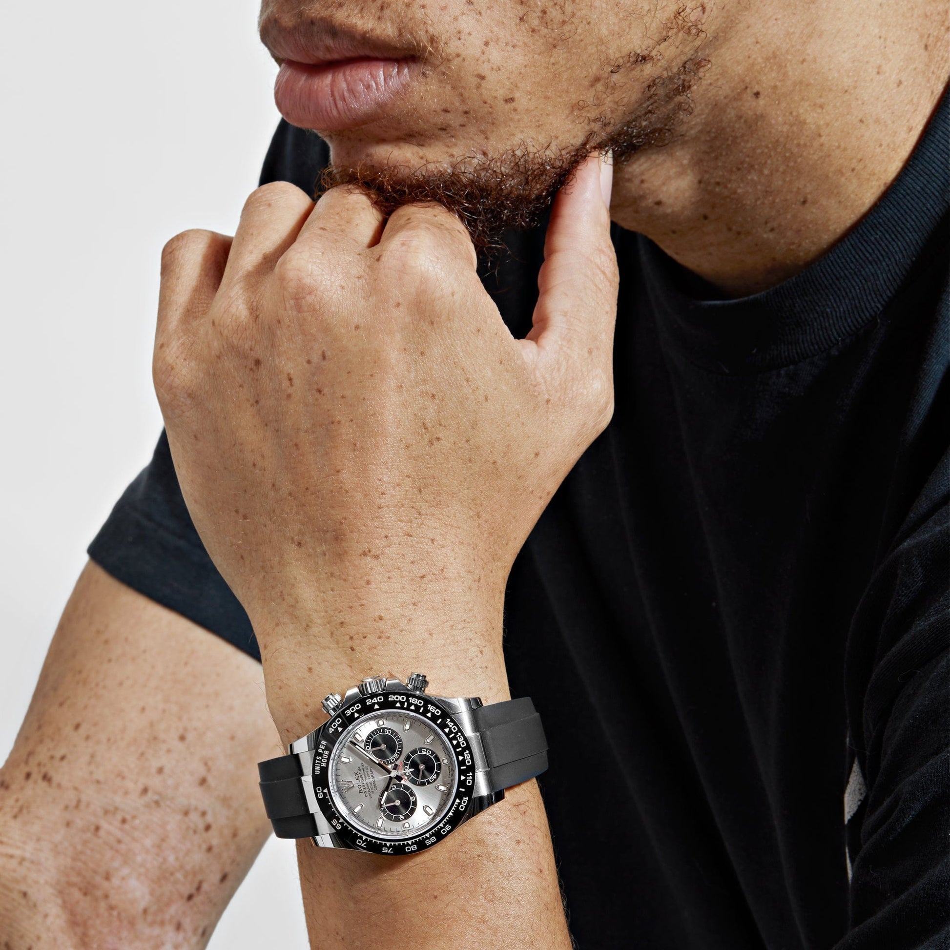 The Rolex Daytona 116519LN 'Ghost' is a sleek and contemporary take on the iconic chronograph, crafted in 18k white gold with a steel and bright black dial that shifts tone subtly in the light. The 40mm case is paired with a black Cerachrom bezel and an Oysterflex rubber strap for a modern, sporty edge.