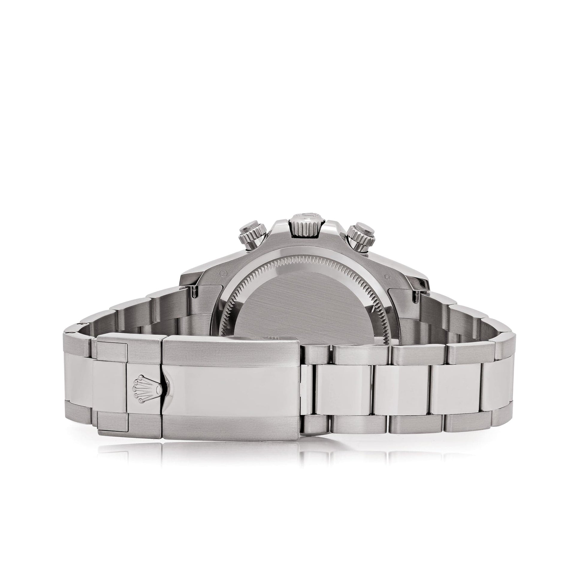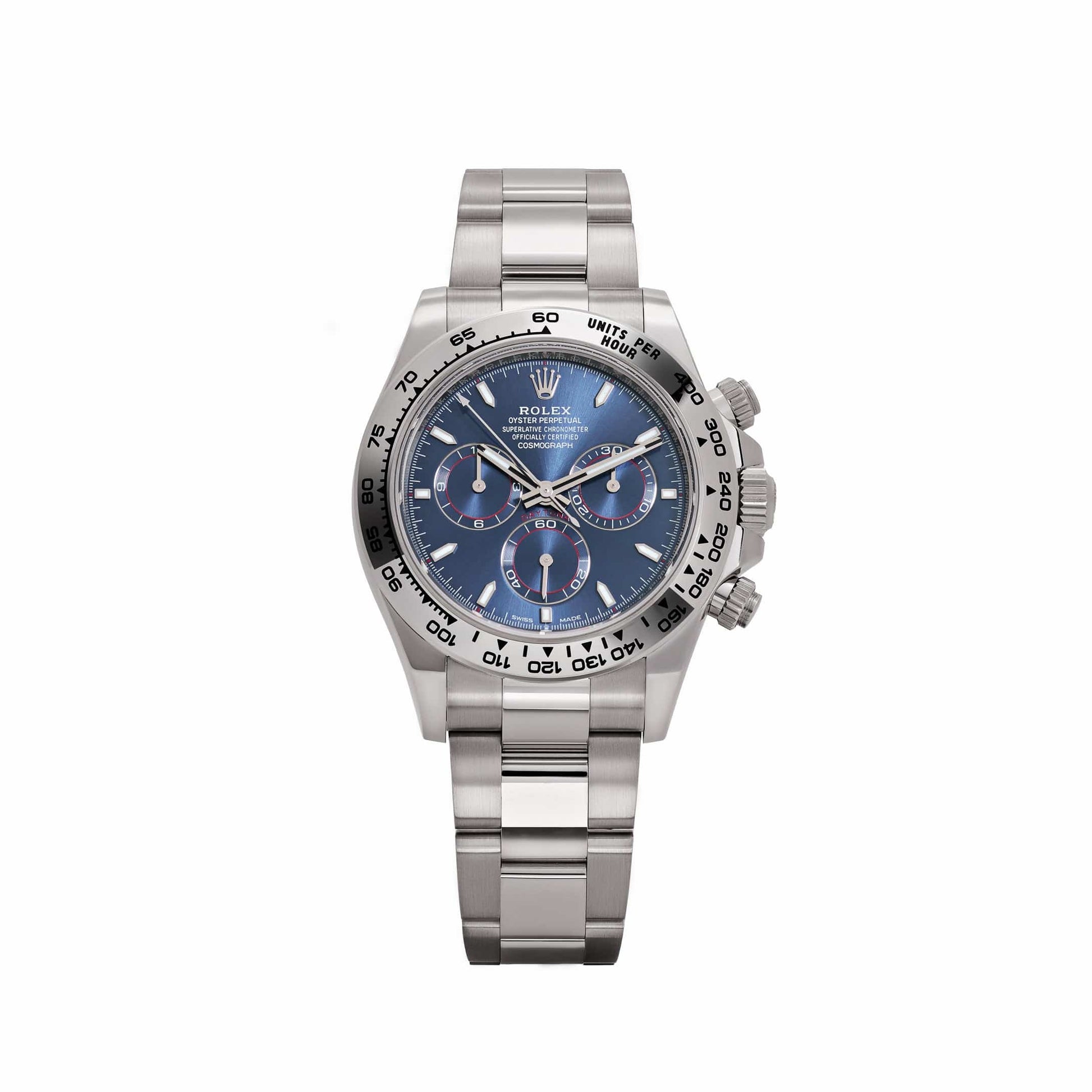 The Rolex Daytona 126509 in 18k white gold with a bright blue dial is a standout reference in the brand’s legendary chronograph collection, combining sporty aesthetics with refined elegance. Its 40mm white gold Oyster case is paired with a matching white gold Oyster bracelet, offering a sleek and substantial wrist presence. The vivid sunburst blue dial, introduced in the 2025 update, features contrasting black subdials, enhancing legibility while delivering a bold, modern look.