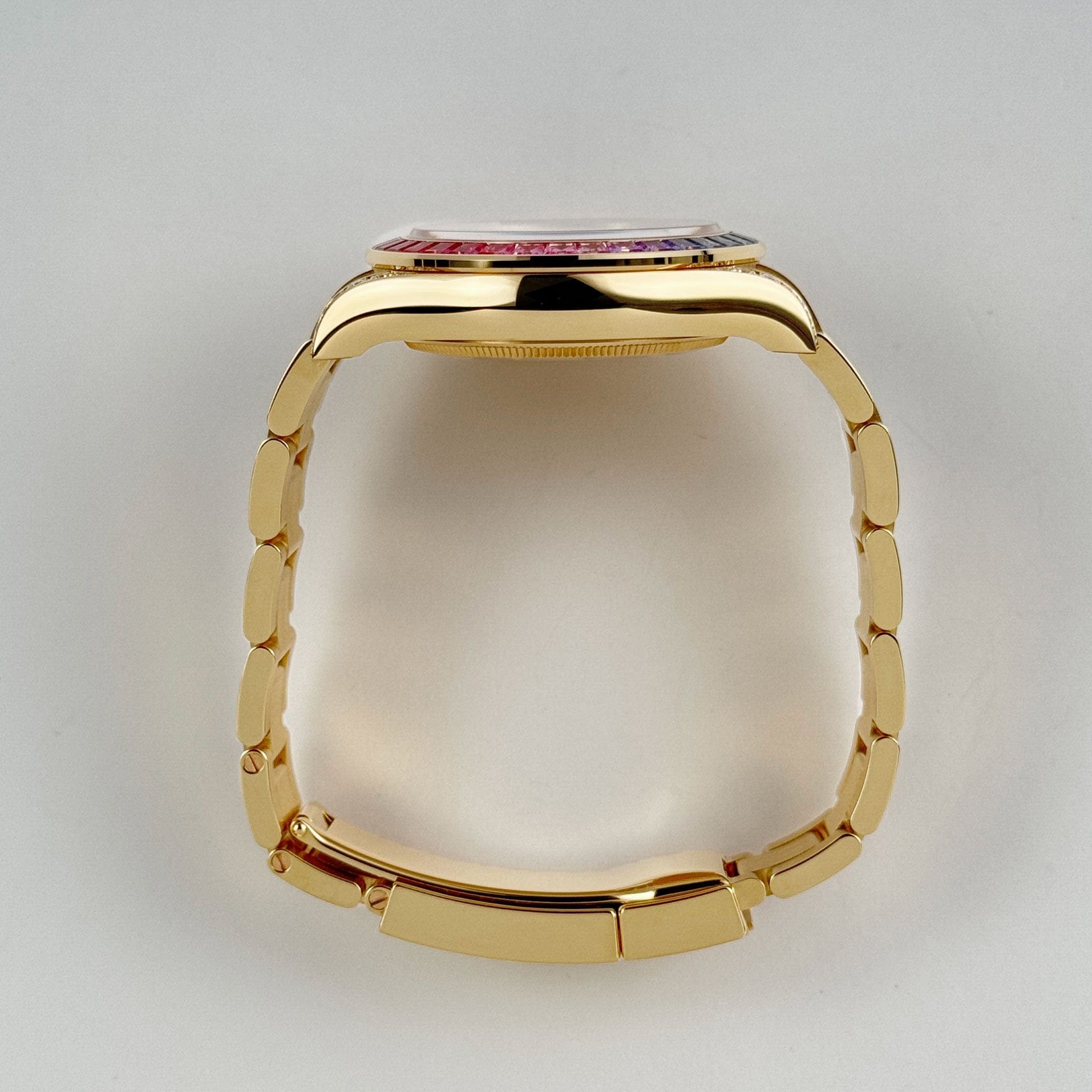 The Rolex Daytona 126598RBOW 'Rainbow' returns in 2025 with its most opulent execution yet. Crafted in yellow gold, this model is defined by its iconic rainbow sapphire bezel, which transitions seamlessly across a gradient of colors. The black lacquer dial is punctuated by sapphire hour markers in matching hues, while the lugs and crown guards are fully diamond-set, adding even more brilliance to the case.