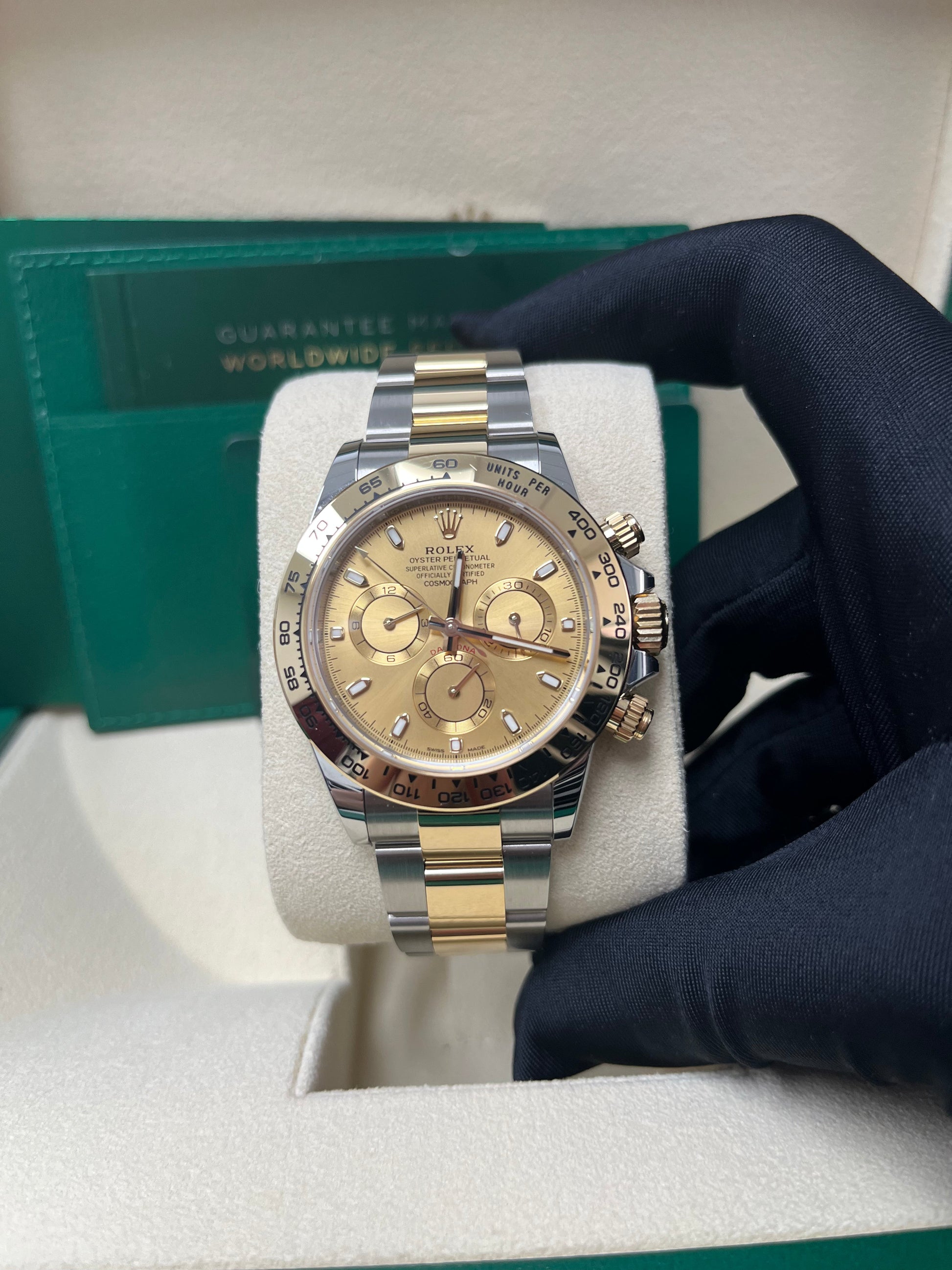 40mm Yellow Rolesor case with 904L steel monobloc middle case, screw-down steel back, screw-down crown and push buttons with Triplock triple waterproofness, fixed 18K yellow gold bezel with engraved tachymetric scale, scratch-resistant sapphire crystal, champagne dial, index hour markers, Rolex calibre 4130 self-winding movement with chronograph central second hand, 30-minute counter at 3 o'clock, and 12-hour counter at 9 o'clock, approximately 72 hours of power reserve, 18K yellow gold Oyster bracelet with flat three-piece links made from a combination of 904L steel and 18K yellow gold, folding Oysterlock buckle with Easylink 5mm comfort extension link. Waterproof to 100 meters.