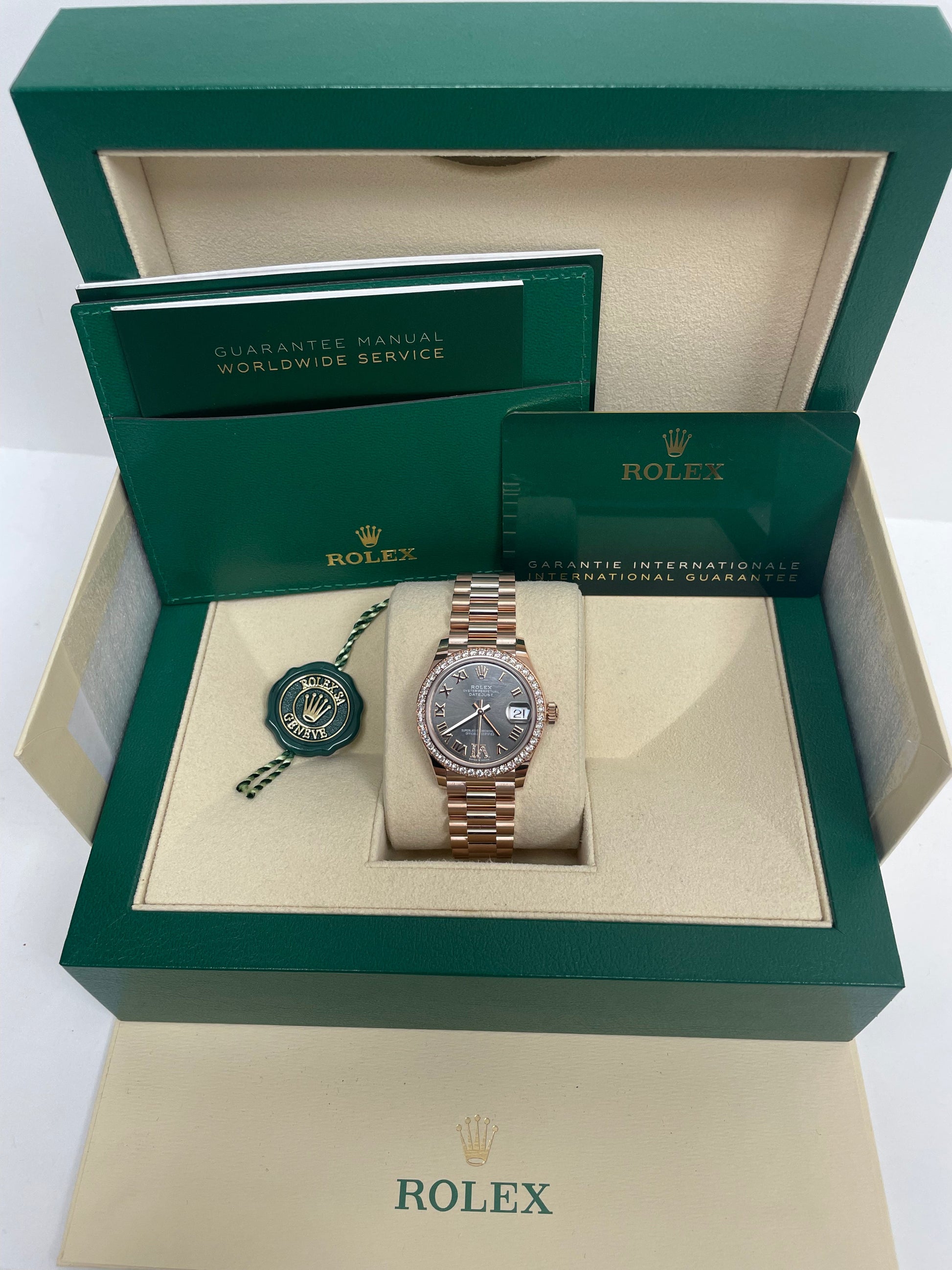 31mm 18K Everose gold case, screw-down crown with twinlock double waterproofness system, bezel set with 46 diamonds, scratch-resistant sapphire crystal with cyclops lens over the date, dark rhodium diamond Roman IV dial, Roman numerals with 11 diamonds set on VI, Rolex calibre 2236 automatic movement with center hour, minute and seconds hands, instantaneous date with rapid setting, and stop-seconds for precise time setting, approximately 55 hours of power reserve, 18K Everose gold Oyster bracelet with flat three-piece links, concealed folding Crownclasp buckle. Waterproof to 100 meters.
