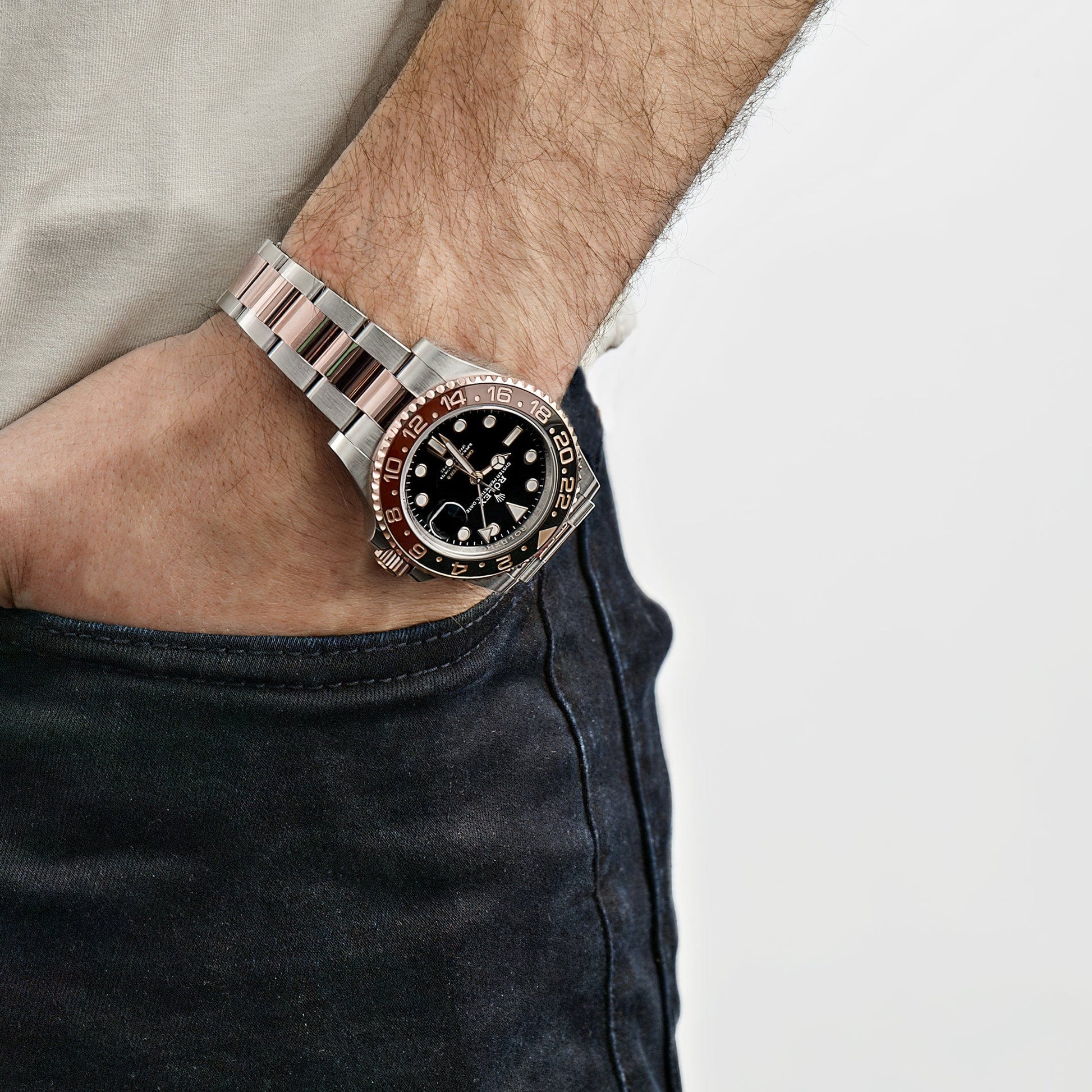 The Rolex GMT-Master II 126711CHNR, affectionately known as the "Root Beer," is a striking blend of luxury and functionality. Crafted from a combination of Rose gold and stainless steel, the 40mm case and Oyster bracelet exude refinement while maintaining durability.