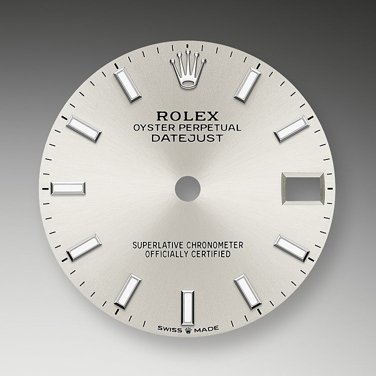 - Dial color: Silver dial with a fine sunrays and a Indexes of 18k White Gold with luminous fill as hour markers
