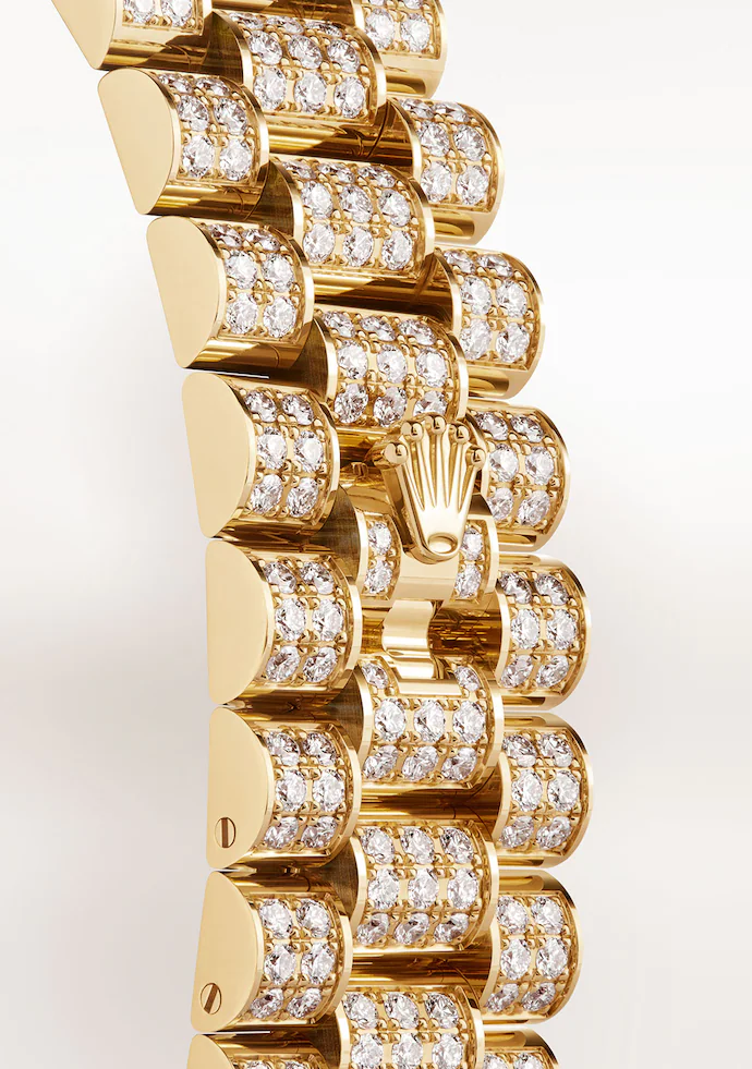 - Bracelet Type: President, three-piece solid links, set with 596 brilliant-cut diamonds