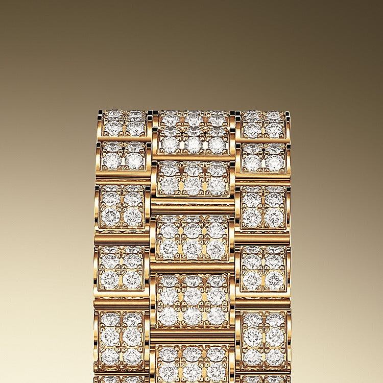 - Dial color: Diamond-paved dial set with 291 diamonds and a applied polished black Roman numerals as hour markers