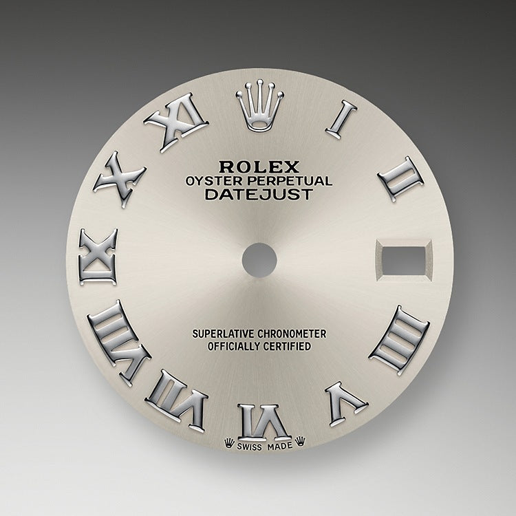 - Dial color: Silver dial with a fine sunrays and a applied polished 18k White Gold Roman numerals as hour markers