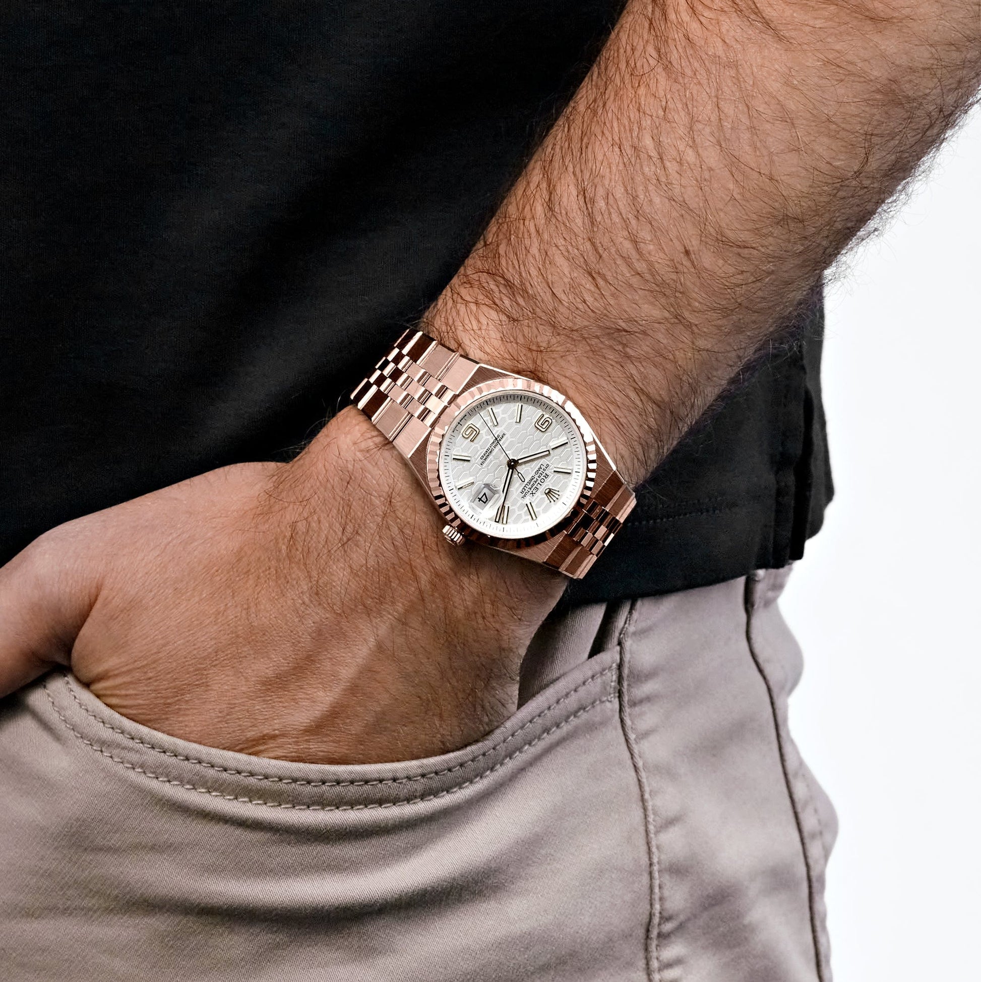 The Rolex Land-Dweller 127235 in rose gold debuts as one of the most luxurious expressions of Rolex’s all-new Land-Dweller line, introduced in 2025. Featuring a 36mm Oyster case, the watch blends the warm, distinctive hue of Everose with the collection’s refined yet functional design language. A fluted bezel, also in rose gold, adds Rolex’s signature touch of elegance, while the case offers the durability expected of a tool watch made for modern exploration.