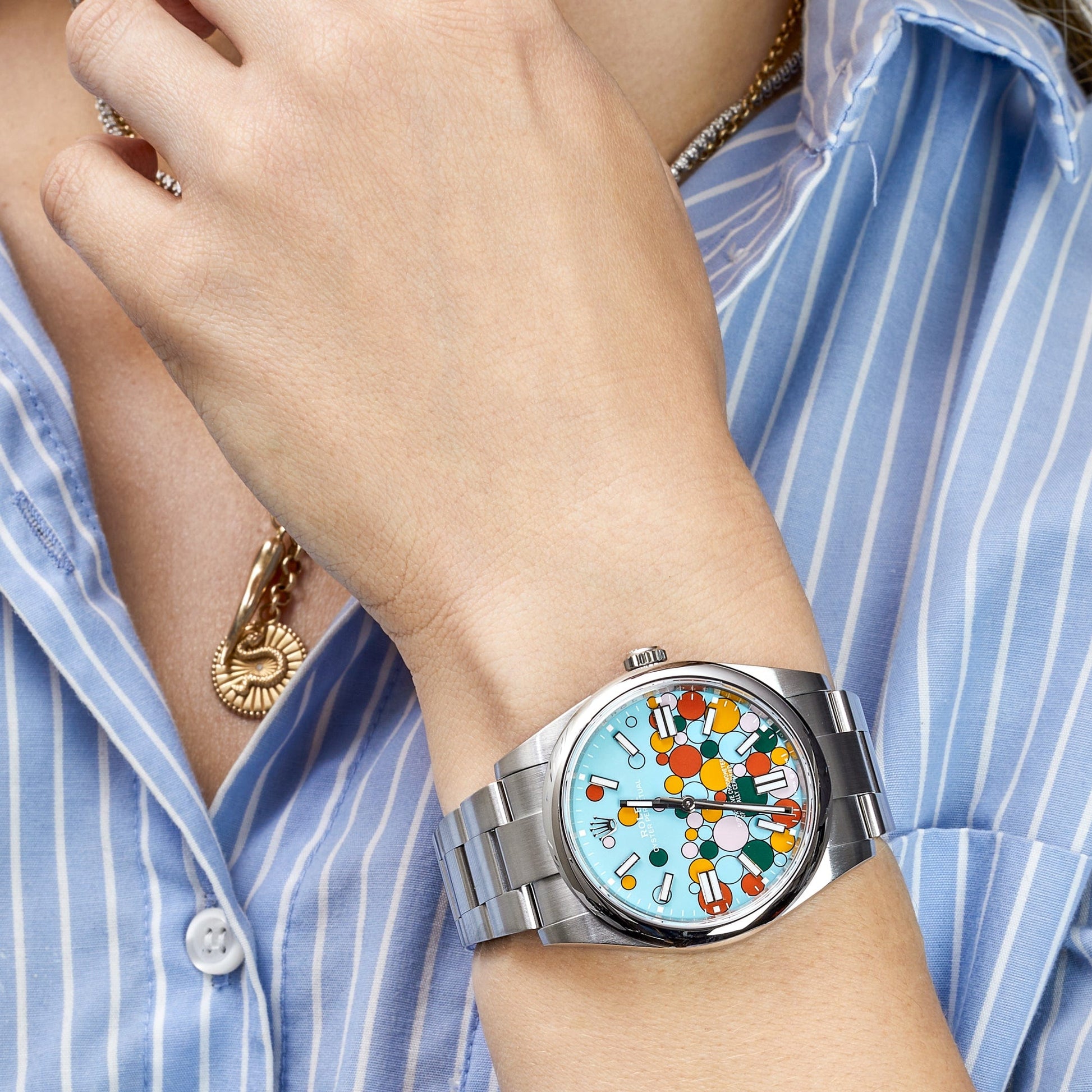 The standout feature is the 'Celebration Motif' dial, a vibrant and artistic composition of multicolored bubbles inspired by Rolex’s signature vivid dial palette. This unique design adds a fresh and dynamic twist to the minimalist elegance of the Oyster Perpetual collection. Baton hour markers and Chromalight-filled hands ensure effortless readability, even in low light.