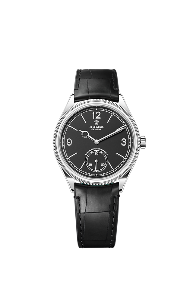 Unworn watch Rolex Perpetual 1908, 39mm, 18k White Gold, Ref# 52509-0002. Striving for the highest level of quality to achieve flawless, long-lasting results is the life philosophy of Rolex. It is in this vein that the global brand has developed a classic collection of watches with a new name and a new look, modestly dressy, ideal for a business suit - Rolex Perpetual 1908. Paying homage to the year in which the "Rolex" lettering first appeared on the dials, the entire Perpetual 1908 model inspired by the watchmaker's first creation to feature a self-winding rotor. Proof of this is the stunning Intense Black dial with superbly long and narrow 18k White Gold applied indexes and Arabic numerals at 12, 3 and 9 o'clock. At 6 o'clock is a small second’s dial, sportier than you might expect, with 20, 40 and 60 on the track. An elegant sword-shaped minute hand with a classic hour hand marked with a ring at the tip, made of 18k White Gold. A well-readable minute scale is applied along the outer contour of the dial. All this charm is complemented by a ribbed, for a comfortable grip, domed screw-down crown in 18k Yellow Gold with the Rolex logo. The dial is covered with a scratch-resistant sapphire crystal. The highlight of the model is the two-tiered 18k White Gold bezel with a convex and tactile upper part and a characteristic grooved lower part. The model is powered by the in-house automatic Rolex mechanical movement caliber 7140, new 2023, contains 38 jewels and has an approximate power reserve of approximately 66 hours. The mesmerizing work of the mechanism can be seen through the transparent case back. This impressive watch is presented on a matt Black alligator leather strap with green lining and tone-on-tone stitching, custom made for this model. It is fitted with an 18k White Gold Dualclasp folding clasp. Thanks to its carefully shaped design, the Dualclasp is always centered on the wrist for maximum comfort. Water resistant up to 50m/165ft (5 ATM).