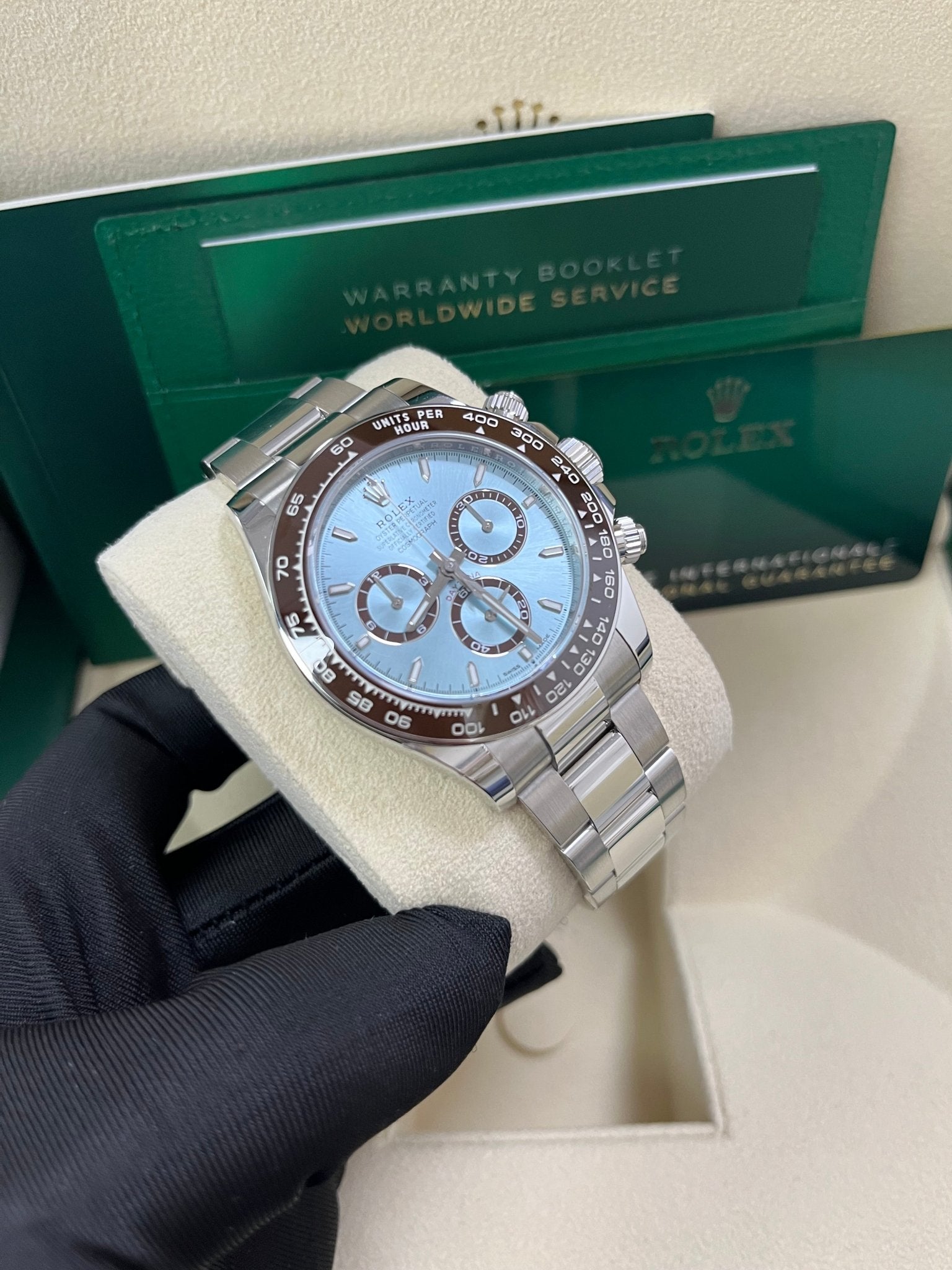 40mm platinum case, screw-down back, screw-down crown with triplock triple waterproofness system, chestnut brown monobloc cerachrom bezel in ceramic with moulded numerals and graduations, scratch-resistant sapphire crystal scratch-resistant sapphire, ice blue dial, index hour markers, 4131, manufacture Rolex perpetual, mechanical chronograph, self-winding movement with centre hour and minute hands, small seconds hand at 6 o'clock, chronograph via centre seconds hand, 30-minute counter at 3 o'clock and 12-hour counter at 9 o'clock, stop seconds for exact time setting, approximately 72 hours of power reserve, Oyster bracelet with three-piece solid links, folding Oysterlock safety buckle with Easylink 5mm comfort extension link. Waterproof to 100 metres / 330 feet.