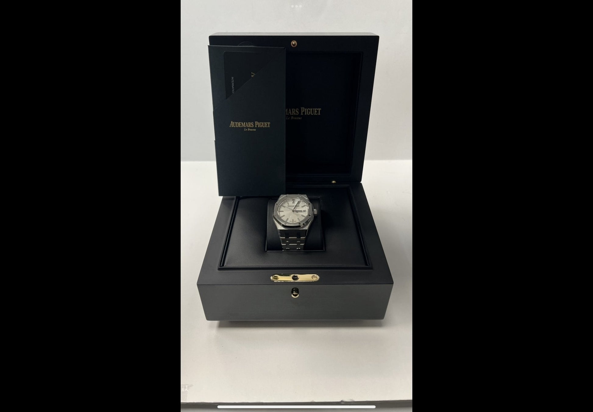 Silver-toned dial with “Grande Tapisserie” pattern, white gold applied hour-markers and Royal Oak hands with luminescent coating. Stainless steel bracelet with AP folding clasp.