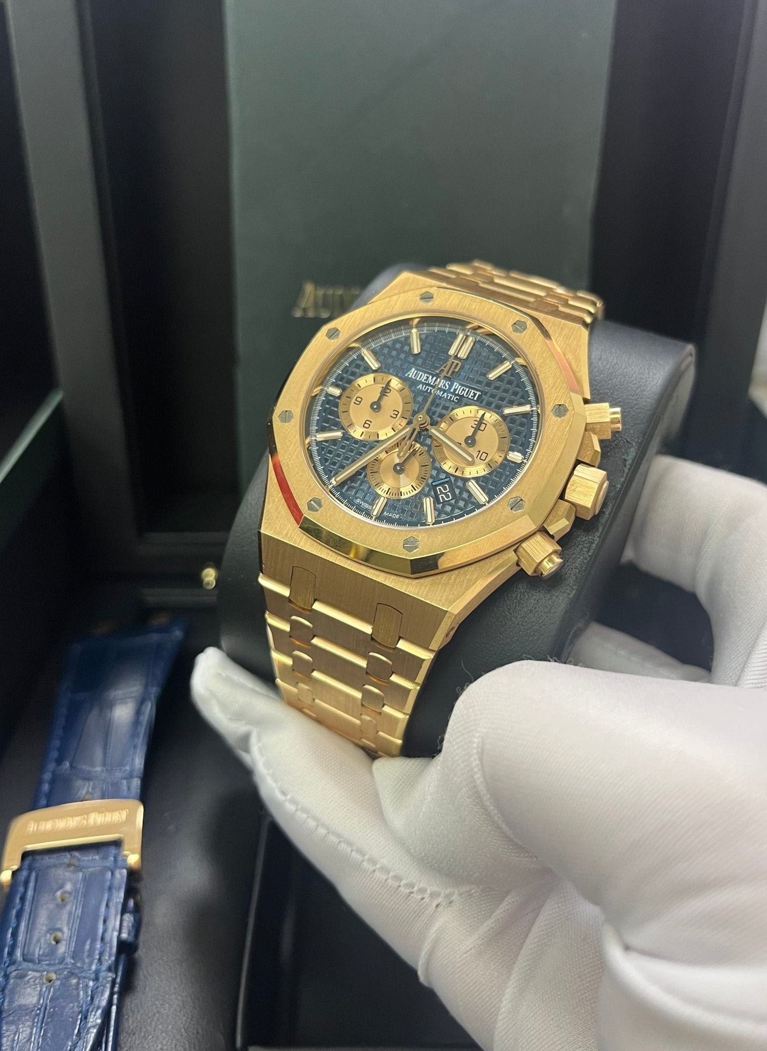 41mm 18K Pink Gold case, 11mm thick, screw-locked crown, glare-proof sapphire crystal, blue dial with Grande Tapisserie” pattern, pink gold-toned counters, pink gold applied hour-markers and Royal Oak hands with luminescent coating, Calibre 2385 selfwinding movement with chronograph, hours, minutes, small seconds, date, approximately 40 hours of power reserve, 18K pink gold bracelet, AP folding buckle. Water-resistant up to 50 meters.
