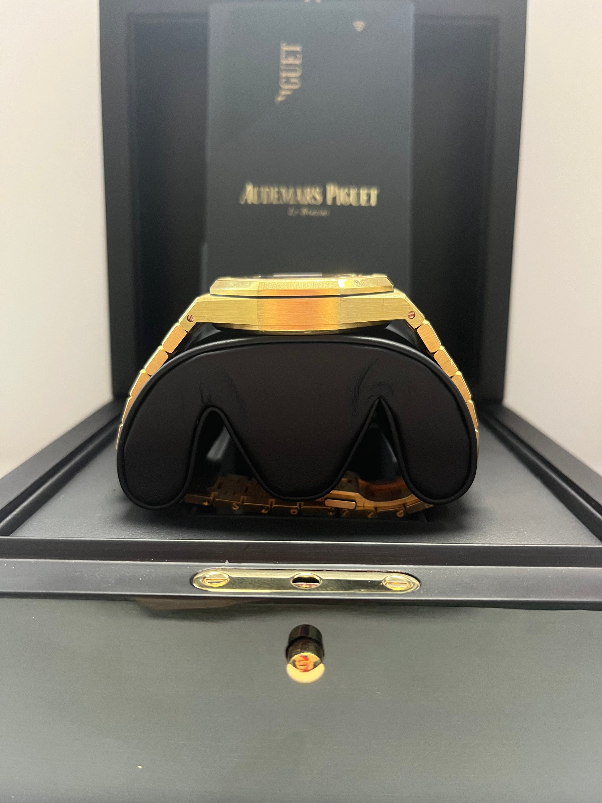 41 mm 18K yellow gold case, 11 mm thick, screw-locked crown, blue dial with Grande Tapisserie pattern, yellow gold-toned counters, yellow gold applied hour-markers and Royal Oak hands with luminescent coating, Calibre 2385 selfwinding movement with chronograph, hours, minutes, small seconds and date, approximately 40 hours of power reserve, 18K yellow gold bracelet, AP folding buckle , comes with additional blue alligator strap. Water resistant to 50 m. 2020.