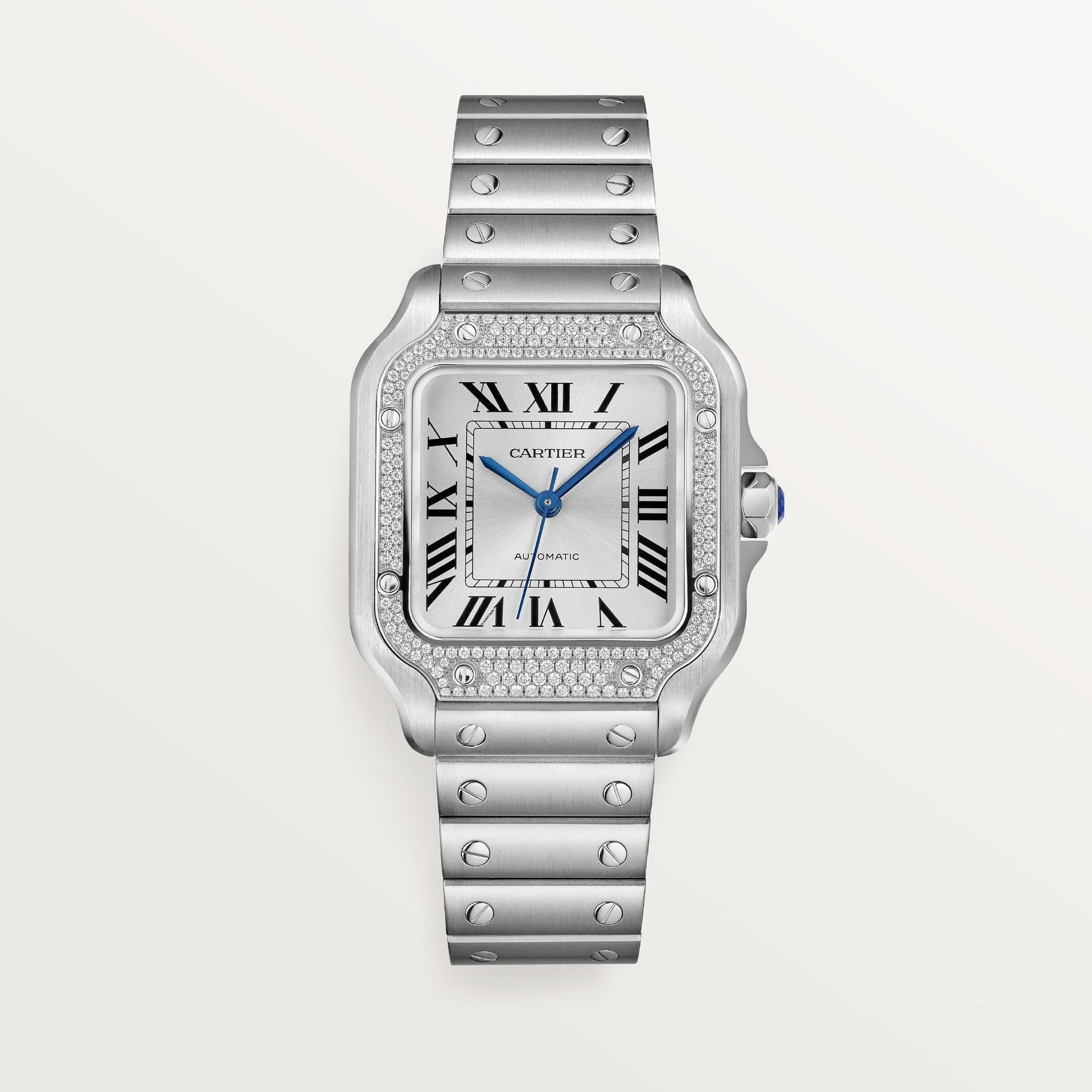 Santos watch, medium model, mechanical movement with automatic winding, caliber 1847 MC. Steel case, steel bezel set with 206 brilliant-cut diamonds totaling 0.64 carats. Heptagonal crown set with a faceted synthetic spinel, sunray dial, blued-steel sword-shaped hands, sapphire crystal. Steel bracelet with “SmartLink” adjustment system. Second bracelet in , with steel interchangeable deployant buckle. Both bracelets are equipped with the “QuickSwitch” interchangeability system. Case width: 35.1 mm, thickness: 8.83 mm. Water-resistant up to 10 bar (approx. 100 meters/330 feet).
