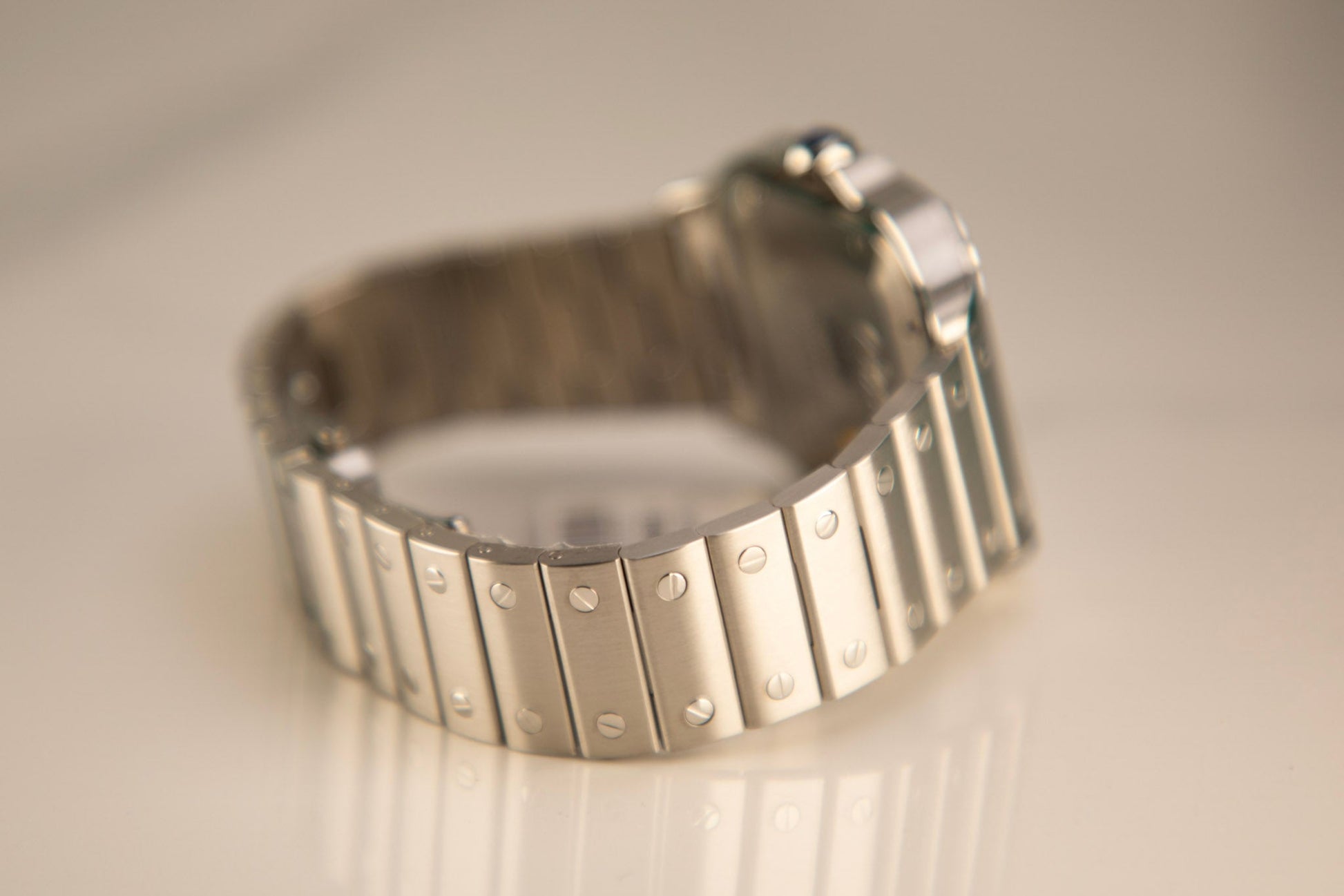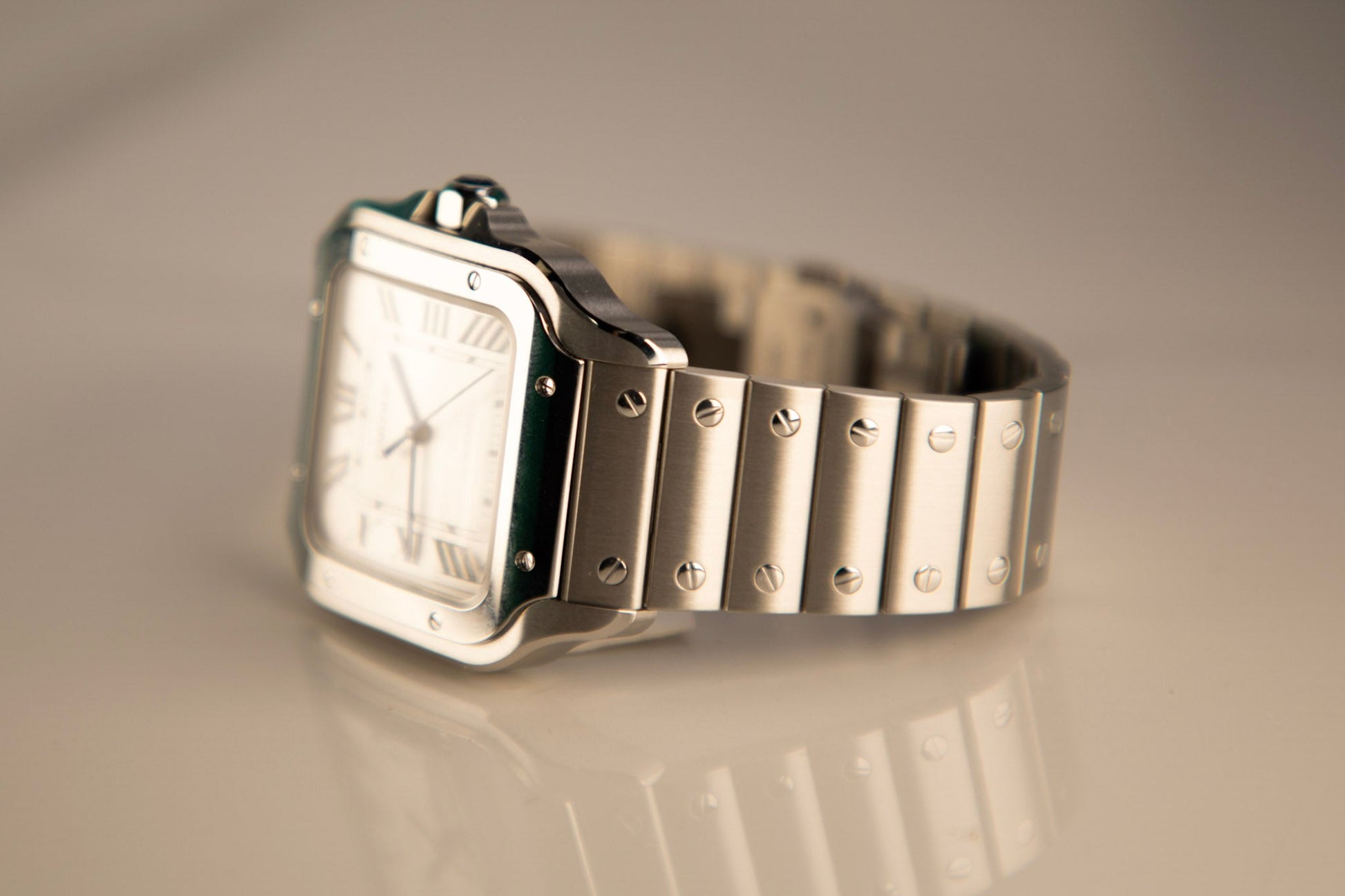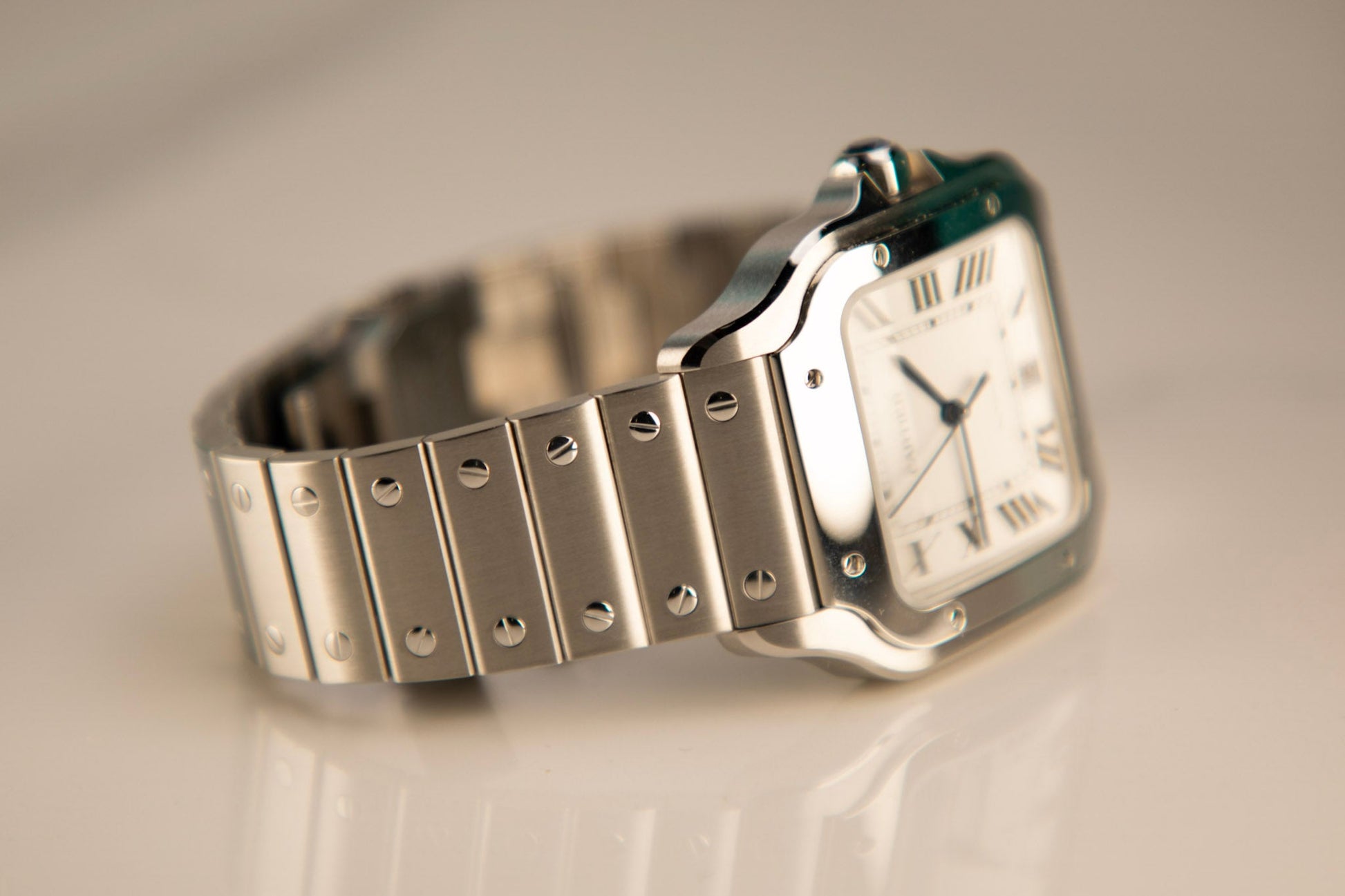 Santos watch, large model, mechanical movement with automatic winding, caliber 1847 MC. Steel case, 7-sided crown set with a faceted synthetic spinel, silvered opaline dial, steel sword-shaped hands, sapphire crystal. Steel bracelet with “SmartLink” adjustment system. Second bracelet in , with interchangeable steel folding buckle. Both bracelets are fitted with the “QuickSwitch” interchangeability system. Case width: 39.8 mm, thickness: 9.38 mm. Water-resistant up to 10 bar (approx. 100 meters/328 feet).
