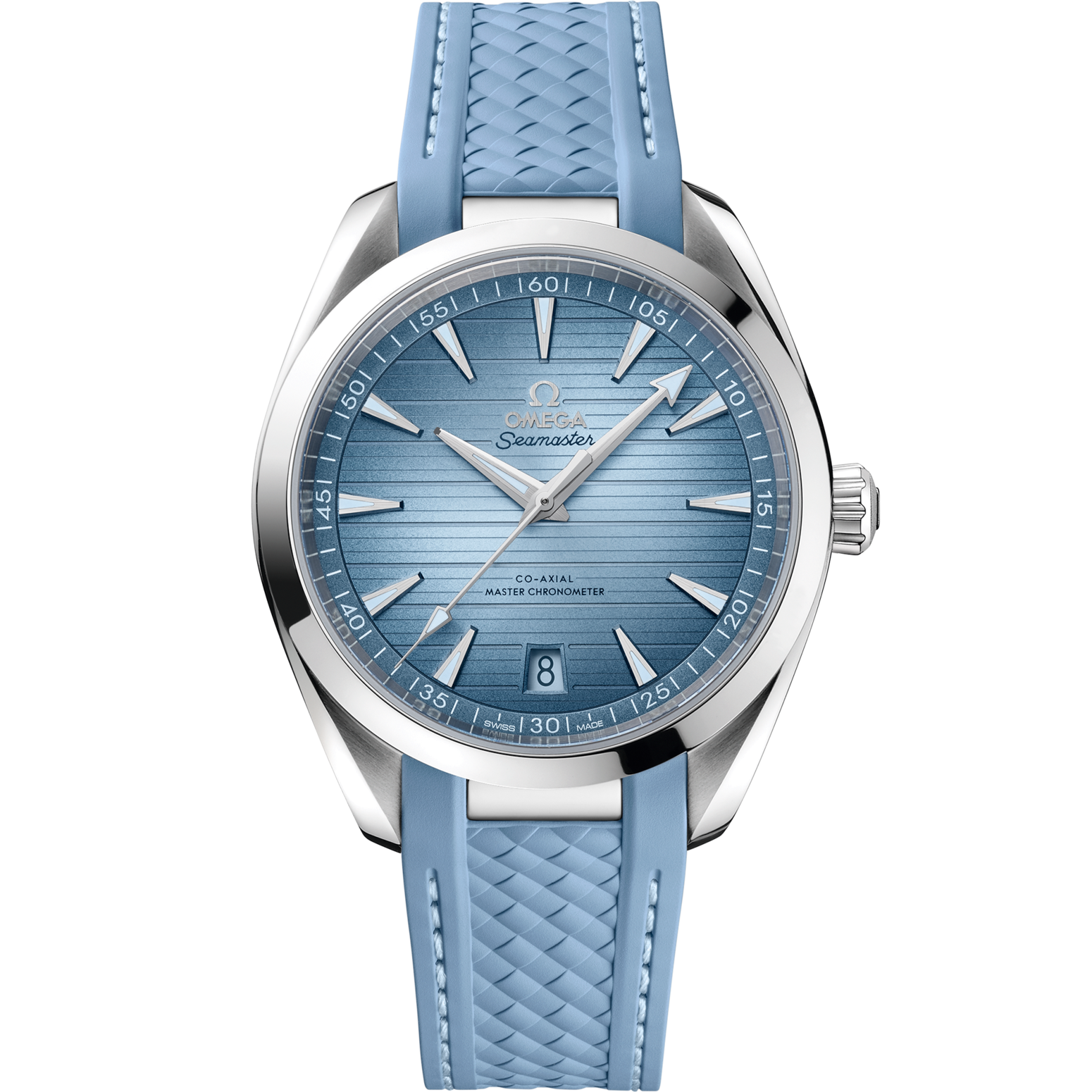 This 41 mm Aqua Terra, with a symmetrical case in polished and brushed stainless steel, has a blue rubber strap, which is integrated into the case and enhanced with a solid polished link in stainless steel.