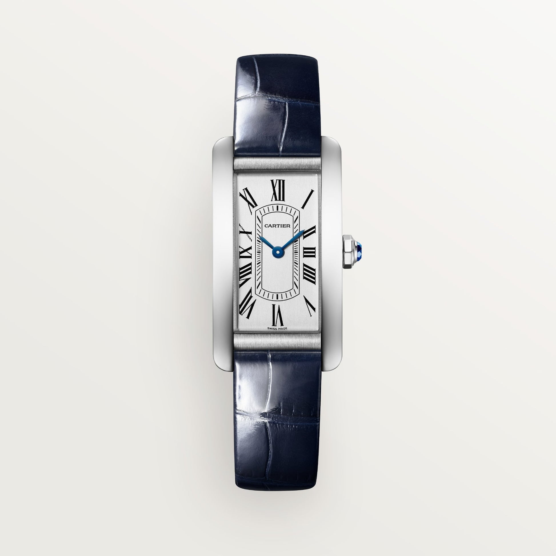Tank Américaine watch, small model, quartz movement. Steel case. Faceted crown with a faceted synthetic blue spinel. Silvered satin-brushed dial, blued-steel sword-shaped hands, sapphire crystal. Shiny blue -skin strap, steel ardillon buckle. Case dimensions: 35.4 mm x 19.4 mm, thickness: 6.8 mm. Water-resistant up to 3 bar (approx. 30 meters/100 feet).