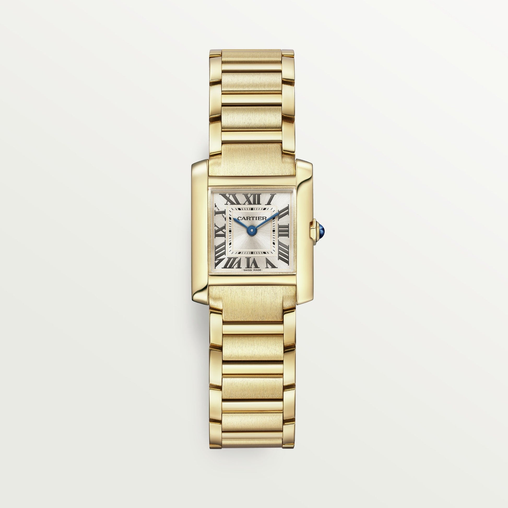 Tank Française watch, small model, quartz movement. Case in 18K yellow gold (750/1000). Faceted crown in 18K yellow gold 750/1000 decorated with a sapphire cabochon. Golden sunray dial, blued-steel sword-shaped hands, sapphire crystal. Bracelet in 18K yellow gold (750/1000). Dimensions: 25.7 mm x 21.2 mm, thickness: 6.8 mm. Water-resistant to 3 bar (approx. 30 meters/100 feet).