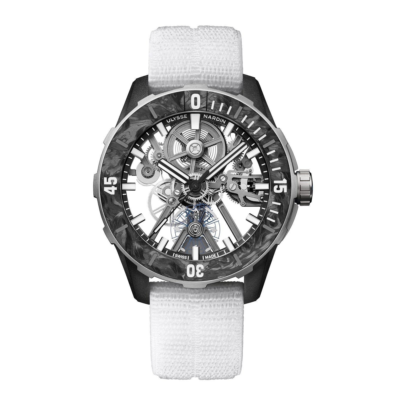 For the independent, Swiss watch manufacture, Ulysse Nardin, limits are meant to be transcended. In the latest edition from its Diver collection, the brand has gone beyond what is expected and what was once believed possible. The result is the new Diver [AIR]: the lightest mechanical dive watch ever made. High horology, high technology, high performance. Building upon the foundation of the Diver X Skeleton UN-372 movement, Ulysse Nardin developed a new, innovative, hightech calibre, the UN-374, which had to be entirely rethought and redesigned. To achieve the Diver [AIR]’s exceptionally light weight of just 52g, including the strap, and under 46g without it, material had to be removed from the Diver X Skeleton’s calibre, while ensuring the watch’s reliability and performance remained uncompromised.