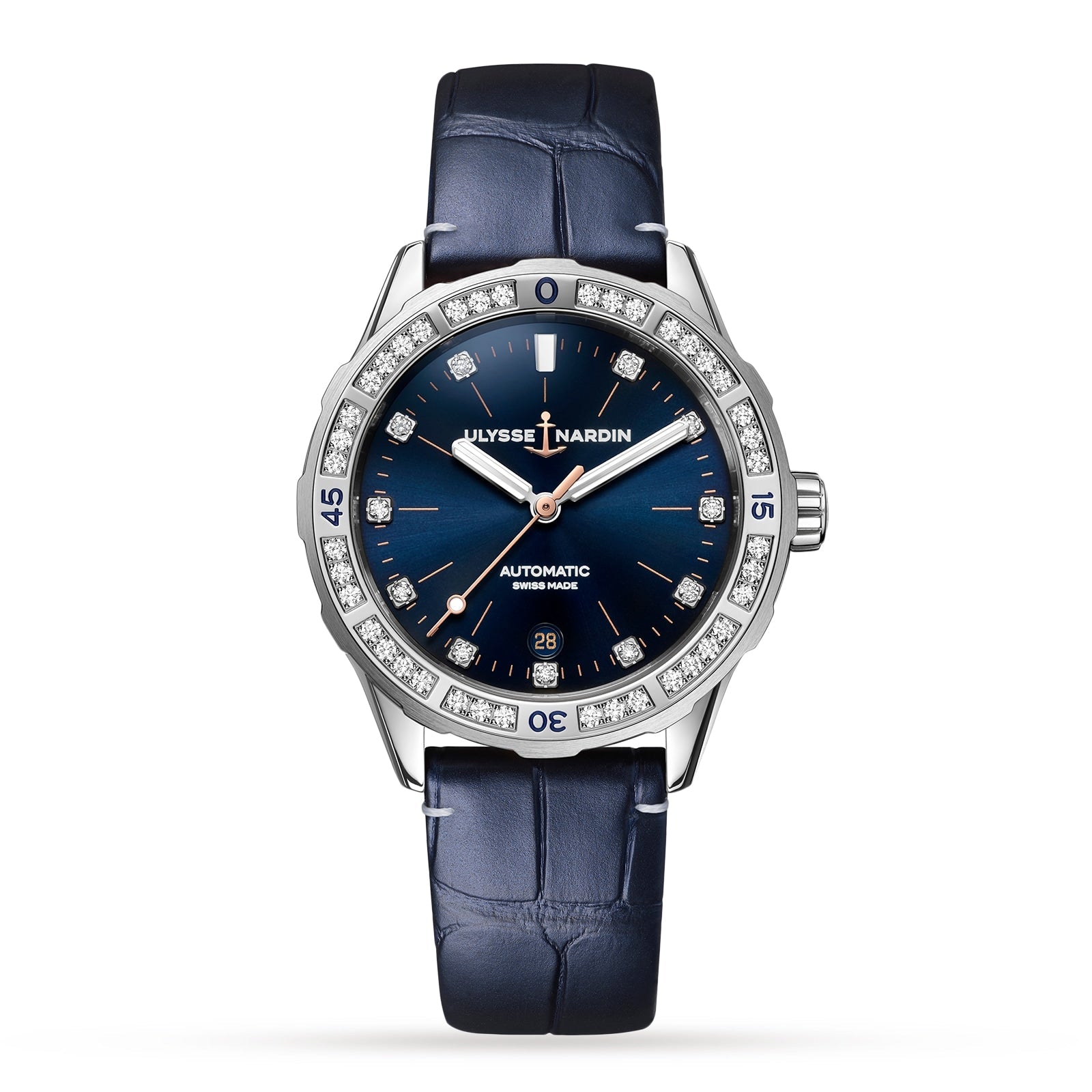 The case of each Ulysse Nardin timepiece is individually numbered on the side. The brillance of the diamond hour markers of the Diver Lady recalls the sparkling surface of the sea. Diver Lady is presented on a leather alligator strap with a stainless steel pin buckle.