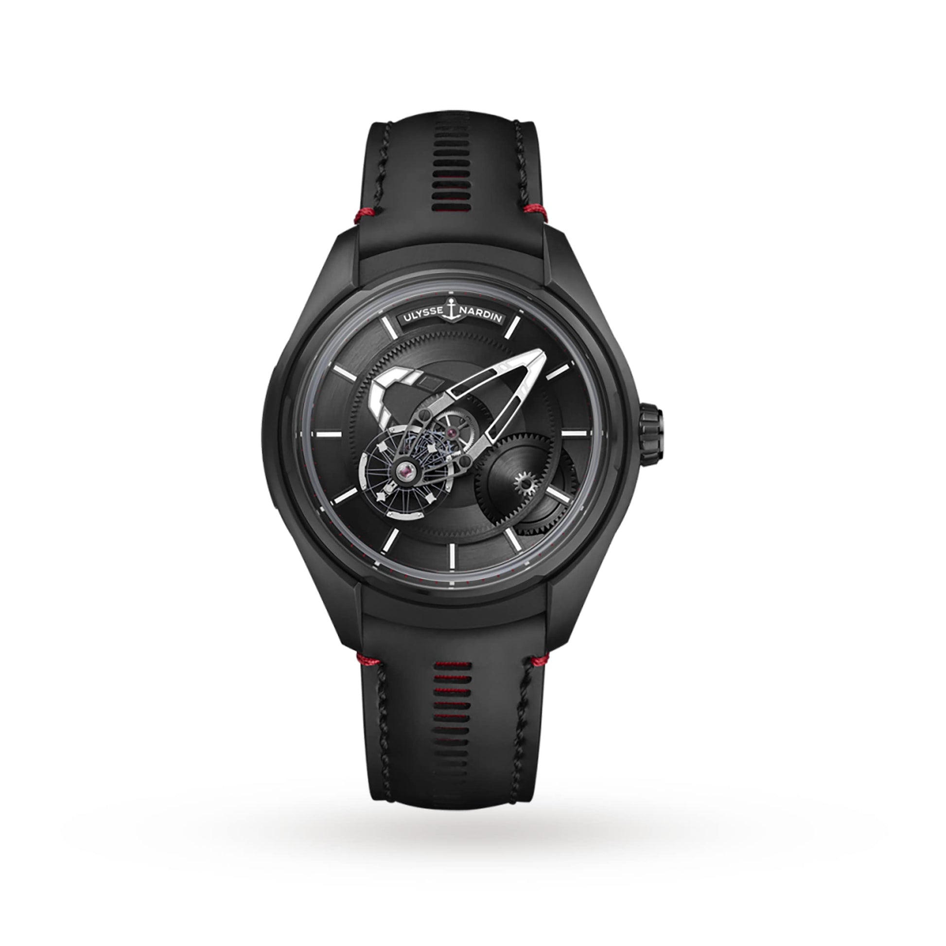 The case of each Ulysse Nardin timepiece is individually numbered on the side. Freak X has no dial and no hands - the central bridge acts as a minute hand and one of the wheels indicates the hours. Freak X is presented on an openwork veal strap with a titanium and DLC folding buckle.