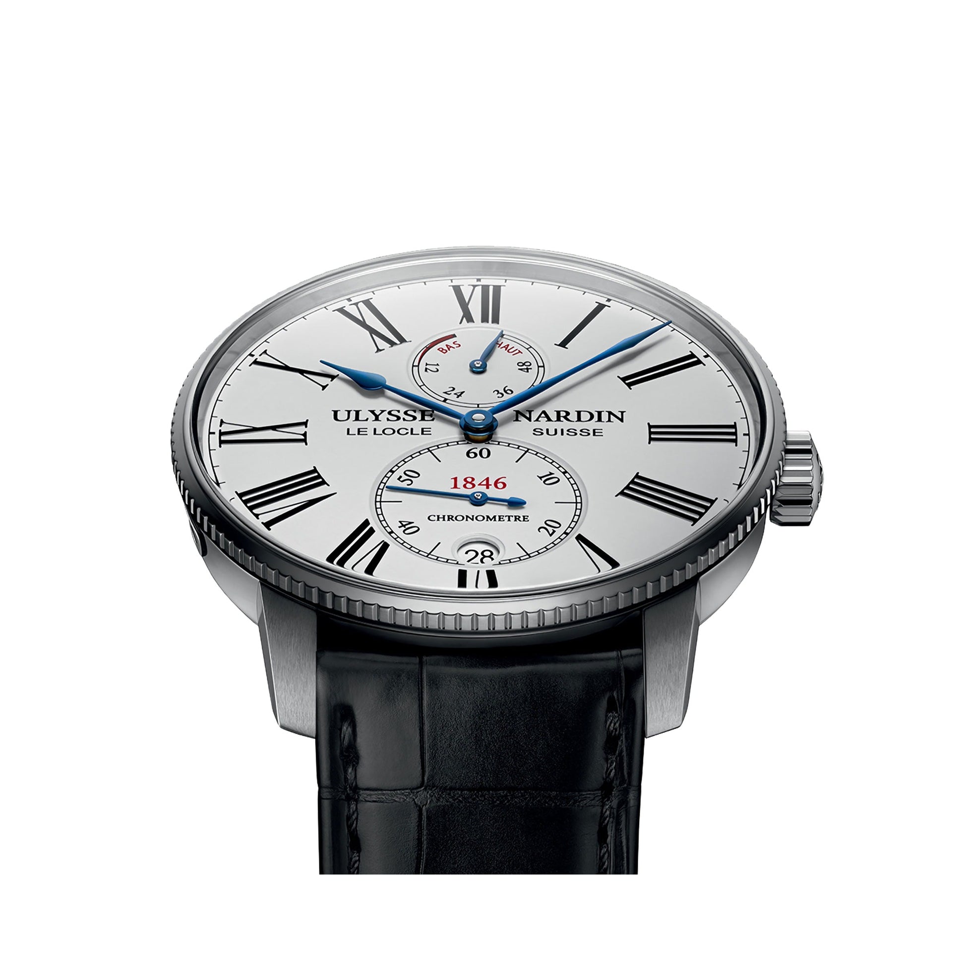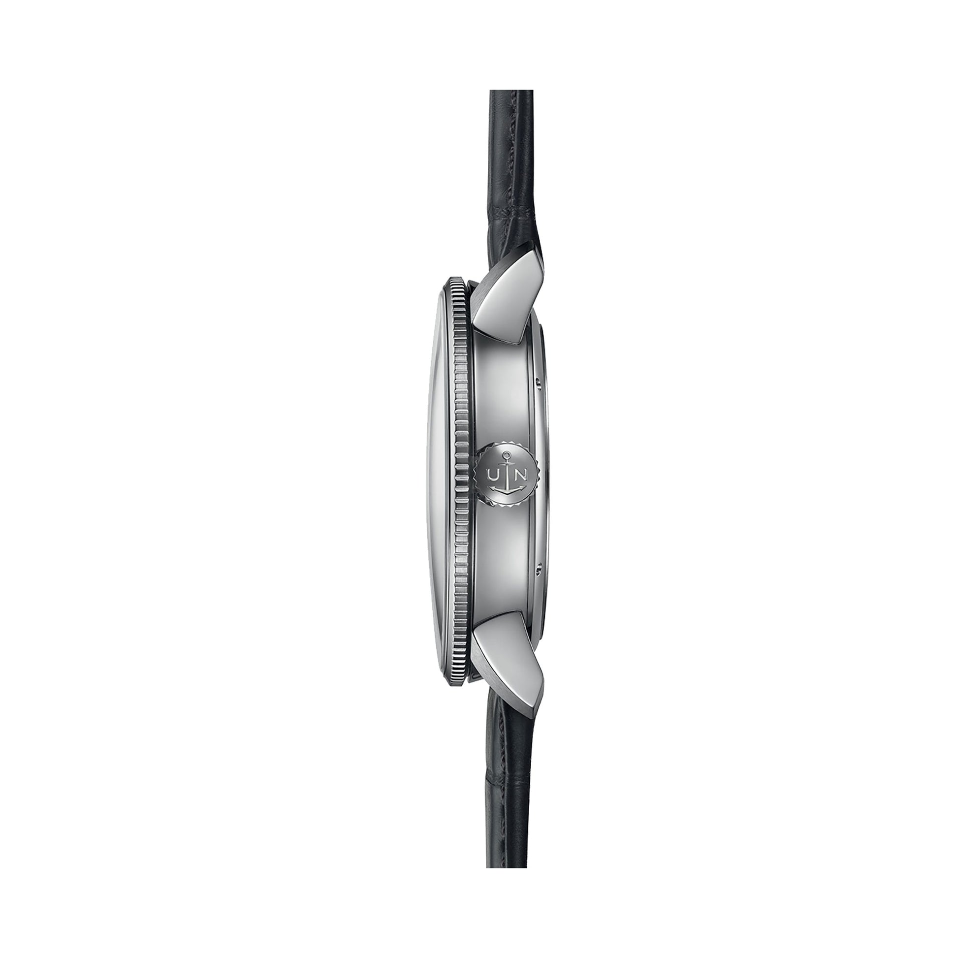 The case of each Ulysse Nardin timepiece is individually numbered on the side. Iconic features of the Marine collection are in evidence: the Roman numeral indexes, and the emblematic logo. Marine Torpilleur is presented on a leather strap with a stainless steel folding buckle.