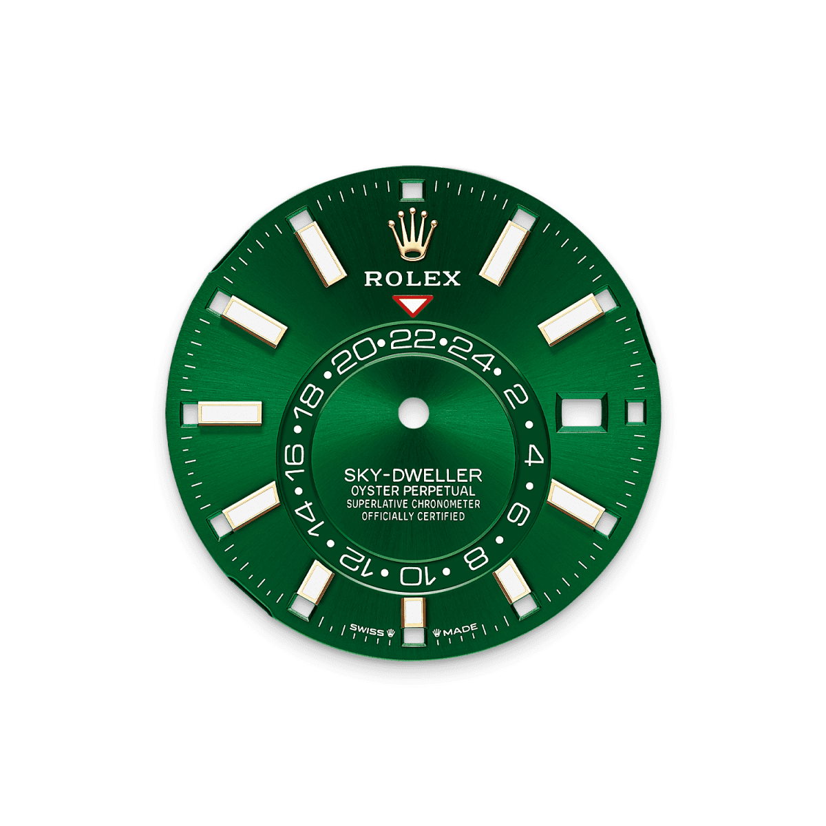 Introducing unworn Rolex Sky-Dweller watch, Ref# 336938-0008 is a masterful blend of sophisticated engineering and luxurious design, tailored for the global traveler. New 2025, from 18k Yellow Gold with 42 mm Oyster case timepiece features a vibrant bright green dial. The dial's Chromalight display ensures legibility in low-light conditions, with rectangular index hour markers and longer hands emitting a long-lasting blue luminescence. A fixed inverted red triangle points to the chosen reference time on the 24-hour disc, and a deep red rectangle in one of the 12 apertures around the dial indicates the current month, enhancing the watch's intuitive readability. At the heart of the Sky-Dweller lies, the Rolex Calibre 9002 contains 40 jewels and has an approximate power reserve of approximately 72 hours powers, a self-winding mechanical movement that offers dual time zone functionality and an annual calendar. The off-center 24-hour disc allows for easy reading of home time, while the central hands display local time. The Saros annual calendar automatically differentiates between 30- and 31-day months, requiring only one date adjustment per year, at the end of February. The fluted bezel in 18k Yellow Gold is a true hallmark of Rolex. Bidirectional rotatable, it is part of the Ring Command system and, when interacting with the crown, allows the user to select watch functions one by one and adjust them easily, quickly and simply. Completing the timepiece is the 18k Yellow Gold Jubilee bracelet, known for its comfort and elegance, featuring five-piece links and equipped with an 18k Yellow Gold folding Oysterclasp and Easylink 5 mm comfort extension link for optimal fit. The Sky-Dweller is waterproof to 100 meters (330 feet), ensuring durability alongside its refined aesthetics.