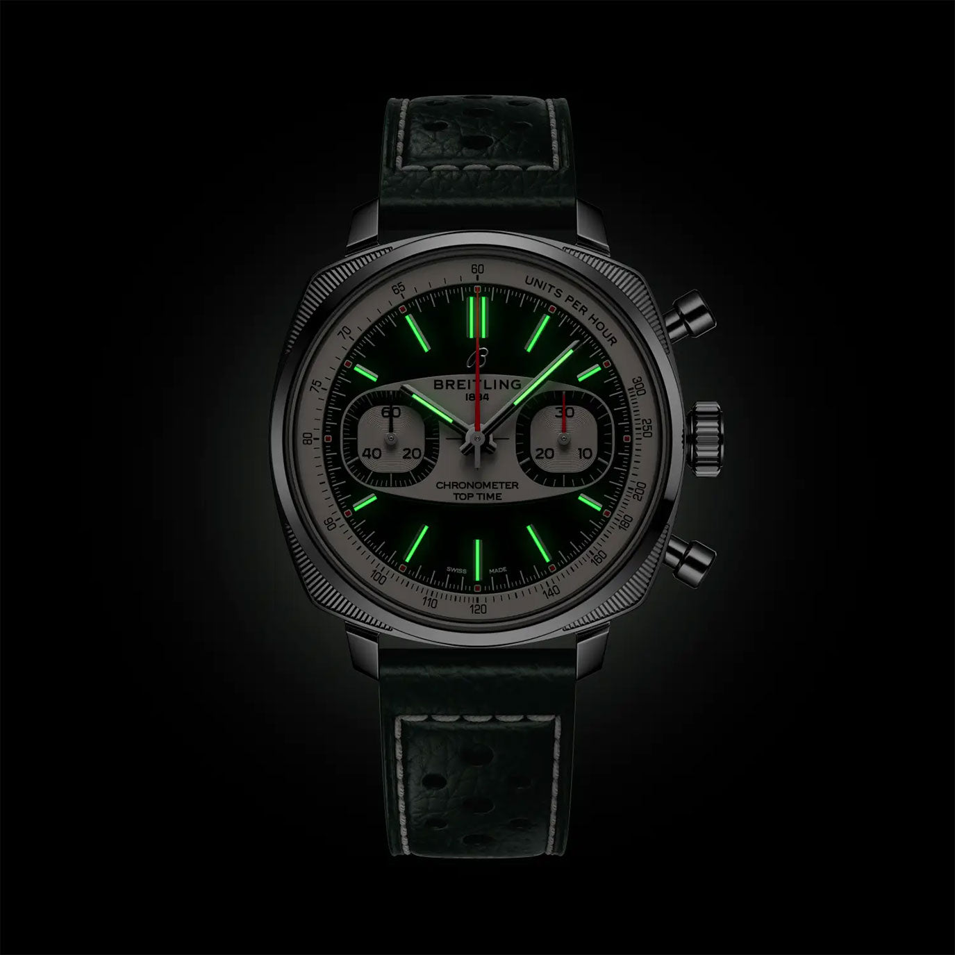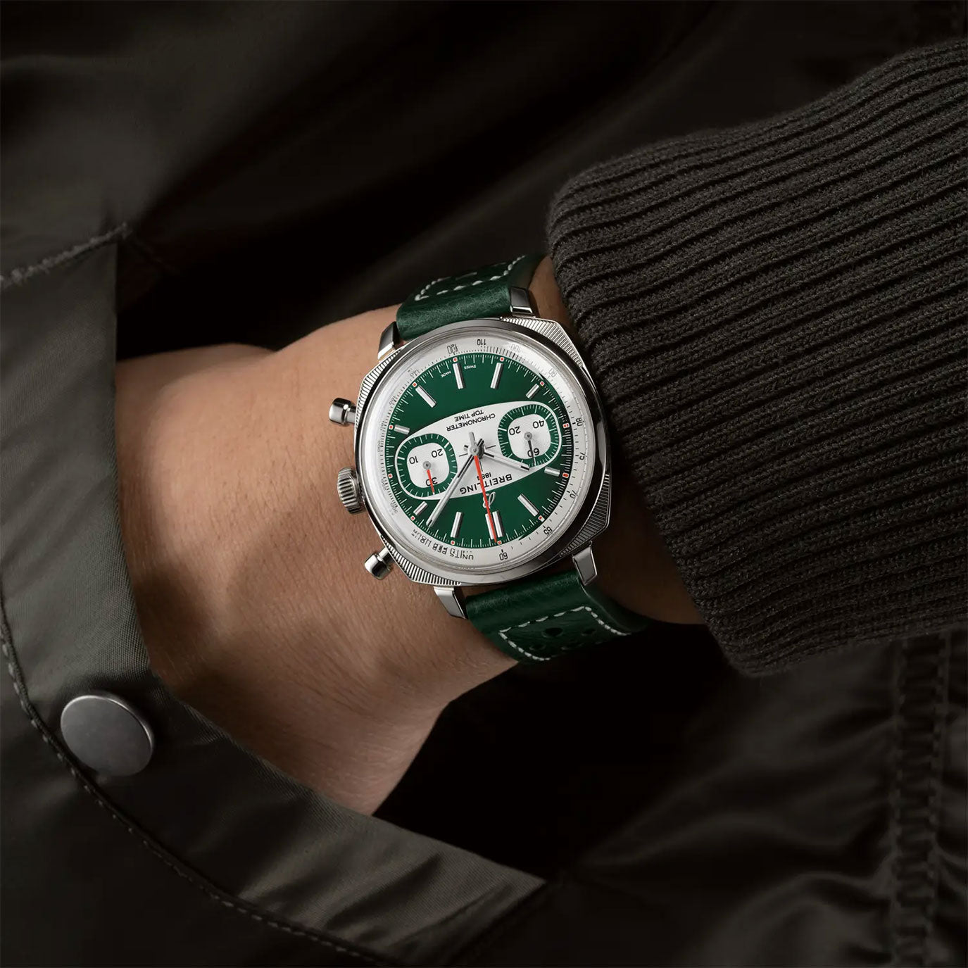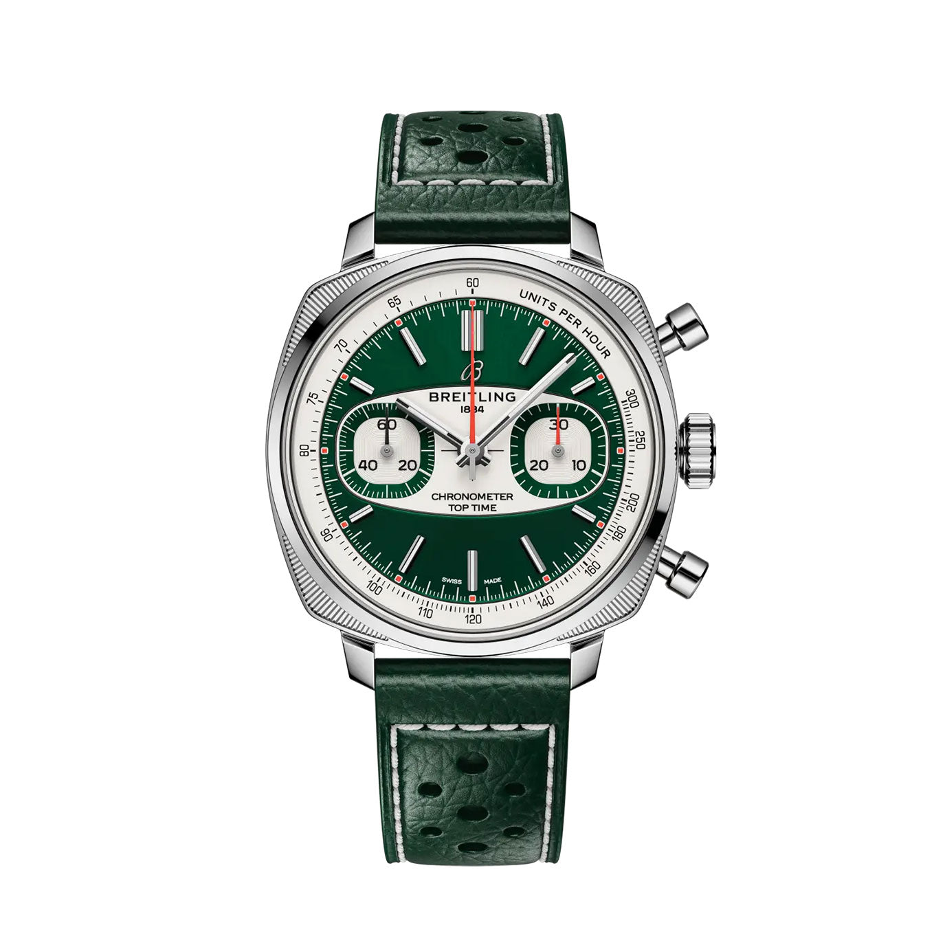 A modern revival of Breitling’s 1960s racing chronograph, the Top Time B01 38 mm captures vintage sportiness with contemporary mechanical excellence. This edition features a compact 38 mm stainless steel case housing the in-house Breitling Manufacture Caliber 01, offering top-tier chronograph functionality with a 70-hour power reserve. The green dial with its classic bi-compax layout is inspired by motorsport heritage, enhanced by the tachymeter scale and red chronograph accents. With a cambered sapphire crystal and 100 m water resistance, this timepiece delivers everyday durability. The straight-cut green calfskin strap with stainless steel tang buckle completes the watch’s retro-modern aesthetic, making it a versatile companion for those who appreciate both history and high performance.