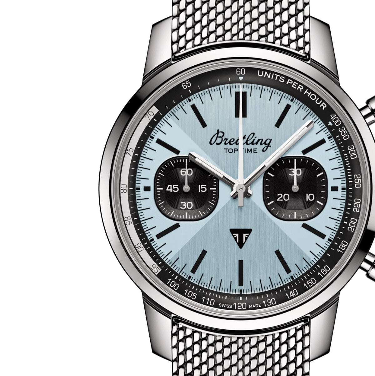 Introducing the Breitling Top Time B01 Triumph, a distinctive timepiece that combines vintage aesthetics with modern craftsmanship. Featuring an ice-blue dial inspired by the Triumph Thunderbird 6T from 1951 and the vintage Breitling Top Time Ref. 815, this watch is a tribute to classic design. The 41mm stainless steel case houses the Breitling Manufacture Caliber 01, offering a 70-hour power reserve and exceptional chronograph functionality. The dial includes a "Zorro" design and contrasting subdials, evoking a vintage dashboard look. This watch is offered in unworn condition, complete with the original Breitling box, booklets, and a Breitling warranty card dated 2024. This full set guarantees authenticity and adds to its collectible value. The Top Time B01 Triumph is perfect for those who appreciate a blend of heritage and innovation in a luxury timepiece. Don't miss the opportunity to own this unique piece of horological history.