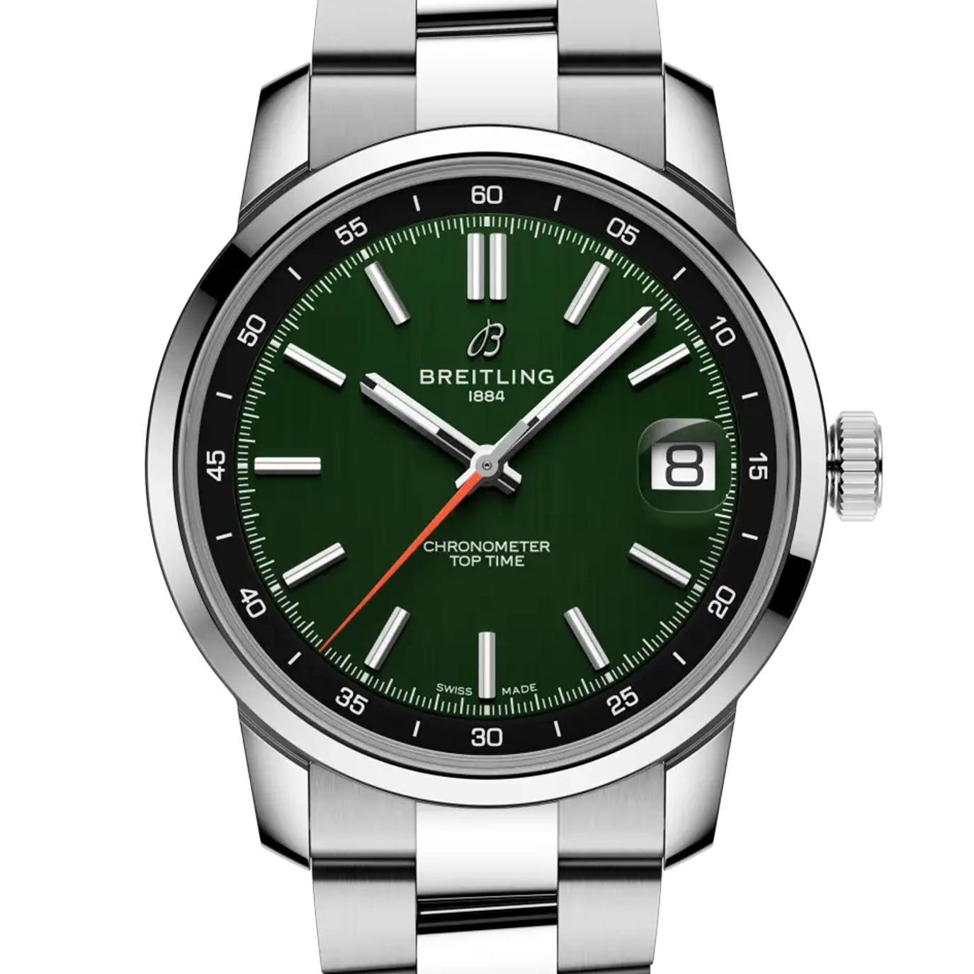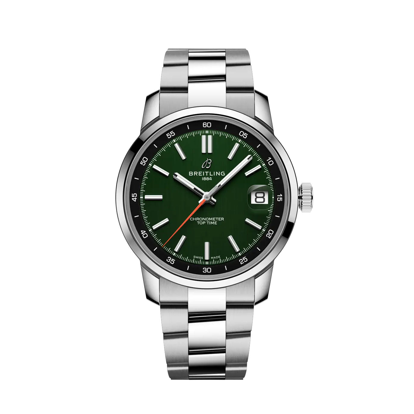 The Breitling Top Time B31 38 mm is a stylish reinterpretation of a 1960s classic, combining vintage motorsport spirit with modern mechanical precision. Its compact 38 mm stainless steel case and streamlined silhouette make it ideal for everyday wear. The watch is powered by the Breitling Manufacture Caliber B31—an in-house, self-winding movement with a 78-hour power reserve, calendar function, and COSC certification for chronometric accuracy. A cambered sapphire crystal with double anti-reflective treatment enhances dial legibility, while the screwed-in sapphire caseback adds a refined touch. The straight metal bracelet in polished steel completes the look, offering a seamless blend of sporty charm and timeless sophistication.