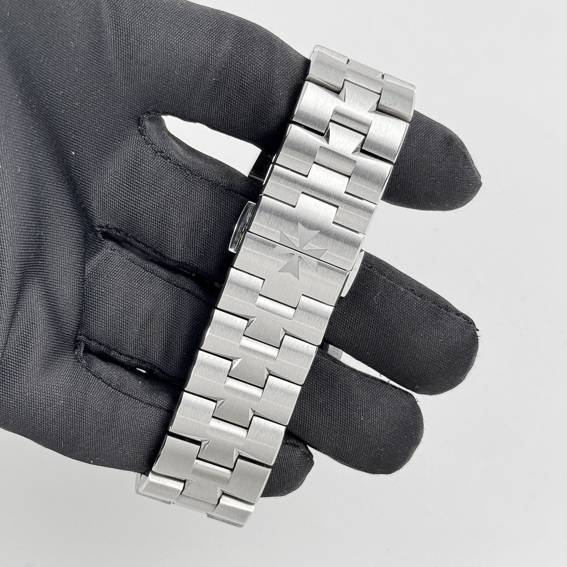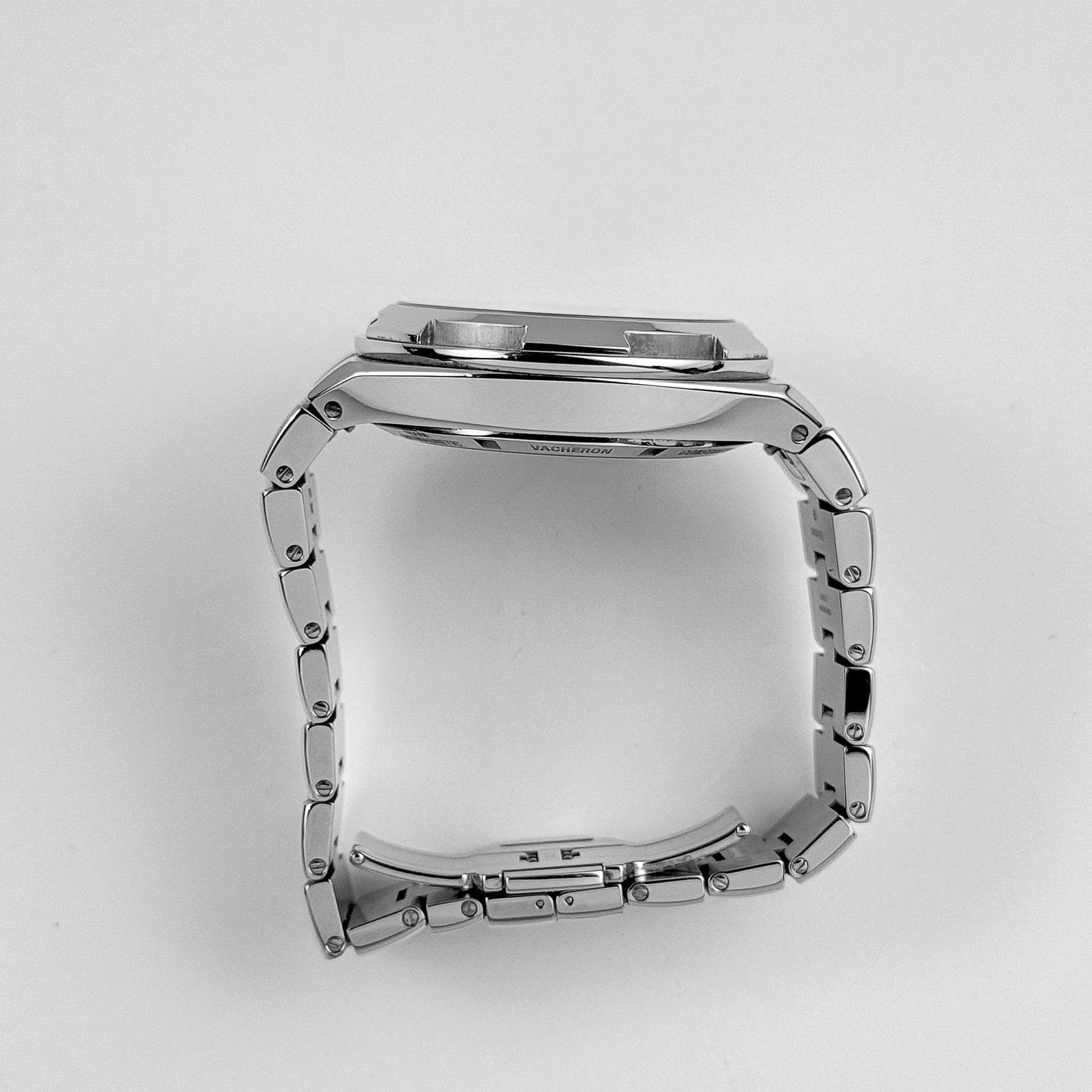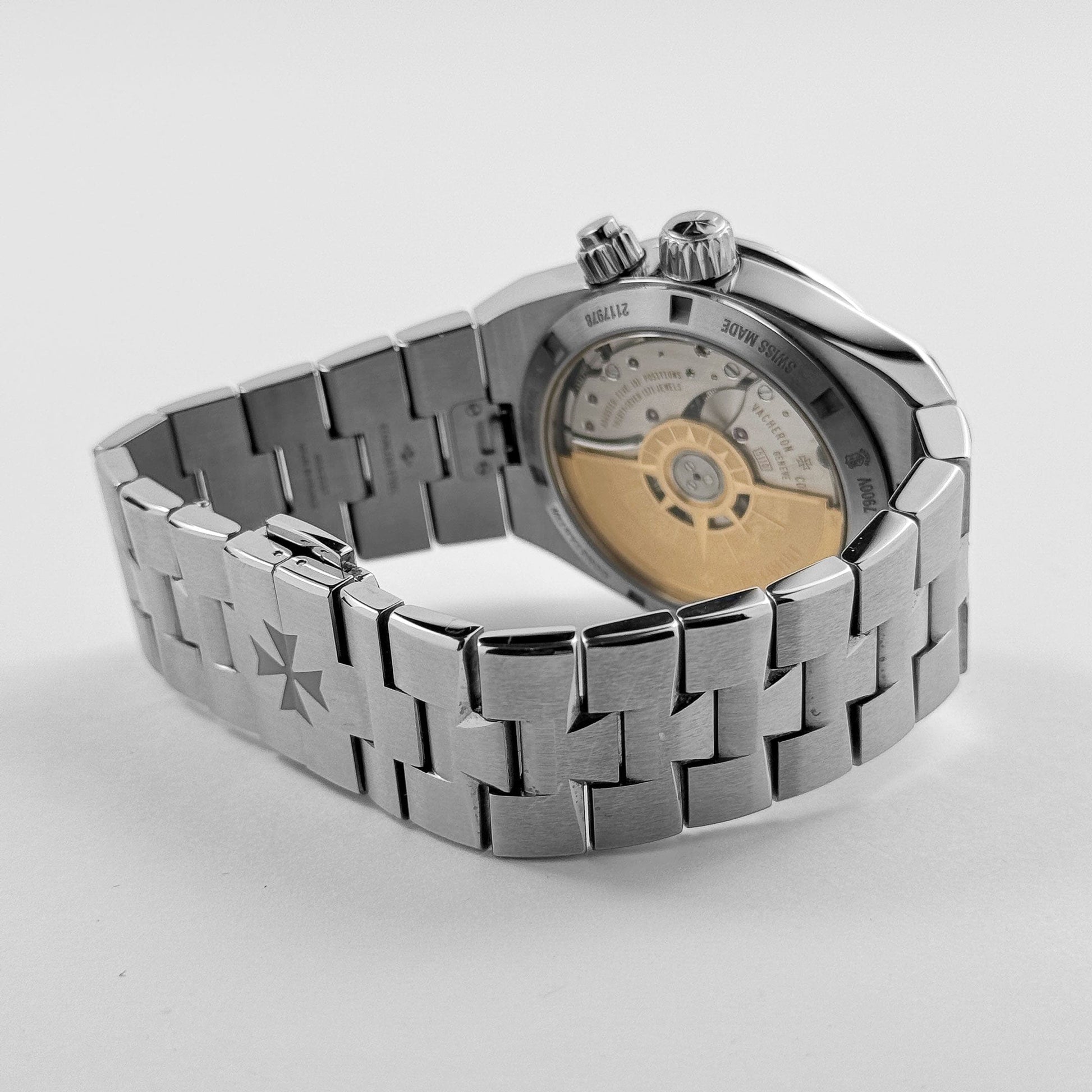 Mechanically, this reference is powered by VC’s in-house calibre 5110 DT, offering approximately 60 hours of power reserve. The case’s water resistance (150 m) and the ability to switch between steel bracelet, blue rubber, and leather straps via tool-free system make it equally suited for travel, formal wear, or casual weekends. The 7900V/110A-B334 has become a favorite among collectors seeking a complete dual time sports watch—refined, capable, and distinct.