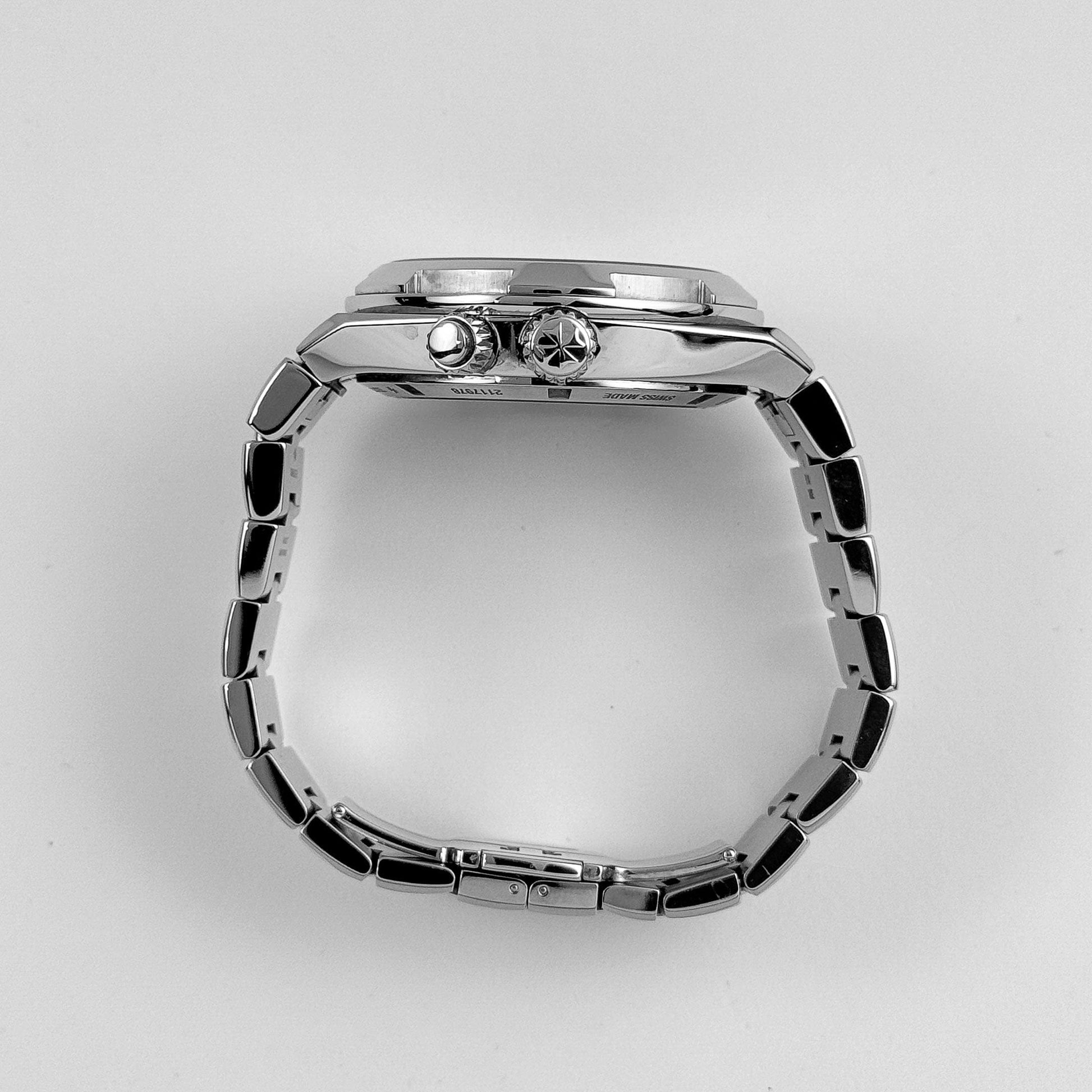 The Vacheron Constantin Overseas Dual Time ref. 7900V/110A-B334 combines travel functionality with elegant sport-luxury in a 41 mm stainless steel case and bezel that embody the Overseas line’s signature geometry. The sunburst blue lacquer dial features applied white-gold hour markers, luminous hands, and a red-tipped pointer hand for a second time zone. A day-/night indicator for home time sits at 9 o’clock, while a pointer-date display occupies the 6 o’clock position—providing intuitive, dual-timezone clarity in one glance.
