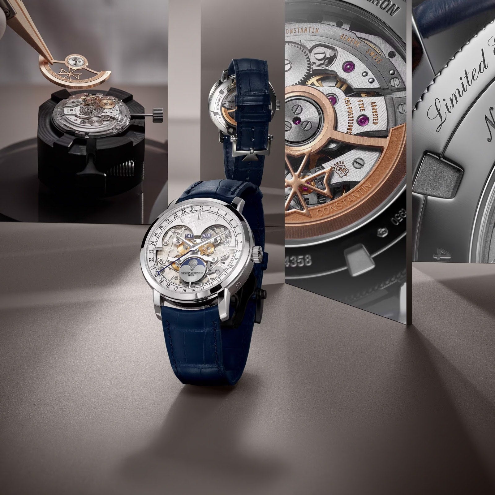 The Traditionnelle Complete calendar watch, entirely sculpted in 950 platinum embodies the Maison's Quest with its avant-garde aesthetics, mechanical sophistication and display of creative expertise. Produced for Vacheron Constantin’s 270th anniversary, this 370-piece limited edition presents an openface dial with a hand-guilloché Maltese cross pattern. A discreet anniversary signature and a “côte unique” finish adorn the self-winding movement. The complete calendar and precision moon phase exude contemporary style, while upholding the Traditionnelle Collection’s stylistic tenets with a stepped round case and lugs, slender bezel and a fluted caseback, railway-type minute track, Dauphine-type hour and minute hands.