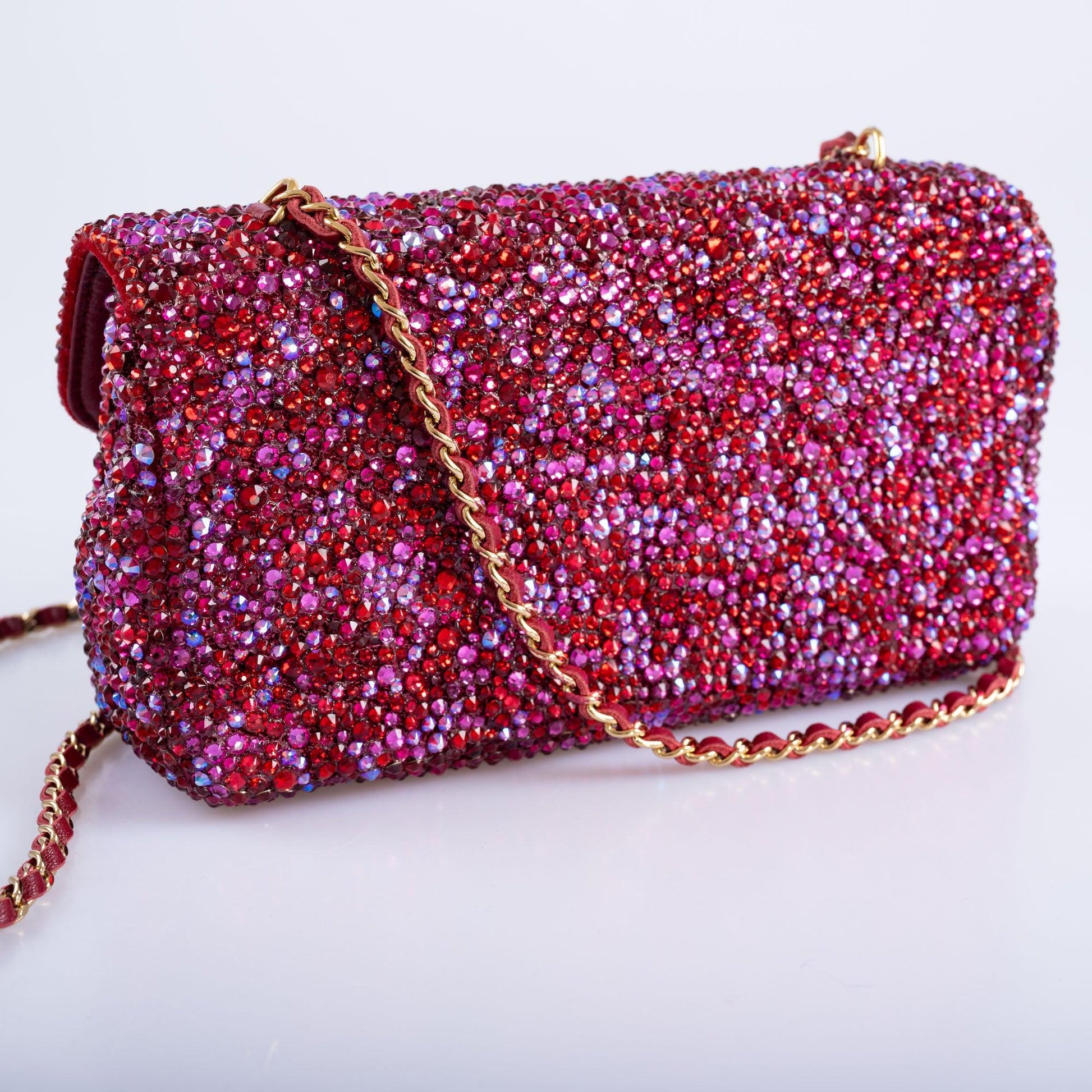 Step into the spotlight with this extraordinary vintage Chanel Camellia Flap Bag, transformed into a showstopping masterpiece with custom Swarovski crystals. This one-of-a-kind piece boasts an intricate design featuring 7 different shades of red and purple crystals, meticulously hand-applied to create a truly breathtaking work of art.
